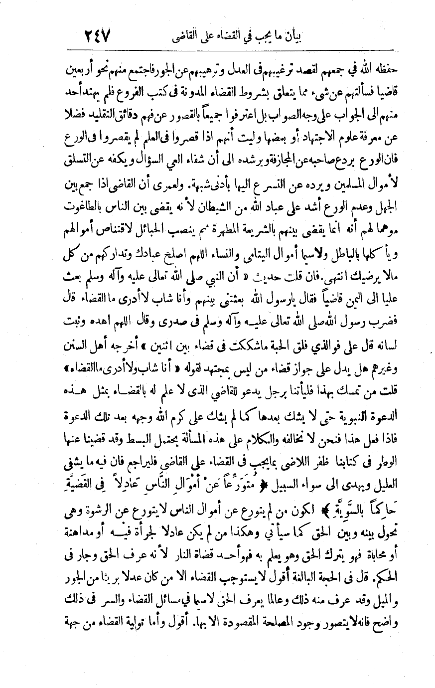 حفظه الله في جمعهم لقصد ترغيبهم في العدل وترهيبهم عن الجور فاجتمع منهم نحو أربعين قاضيا فسألتهم عن شئ مما يتعلق بشروط القضاء المدونة في كتب الفروع فلم يهتد أحد منهم إلى الجواب على وجه الصواب بل اعترفوا جمعيا بالقصور عن فهم دقائق التقليد فضلا عن معرفة علوم الاجتهاد أو بعضها وليت أنهم إذا قصروا لم يقصروا في الورع فإن الورع يردع صاحبه عن المجازفة ويرشده إلى أن شفاء العي السؤال ويكفه عن التسلق لأموال المسلمين ويرده عن التسرع إليها بأدنى شبهة ولعمري أن القاضي إذا جمع بين الجهل وعدم الورع أشد على عباد الله من الشيطان لأنه يقضي بين الناس بالطاغوت موهما لهم أنه إنما يقضي بينهم بالشريعة المطهرة ثم ينصب الجبائل لاقتناص أموالهم ويأكلها بالباطل ولا سيما أموال اليتامى والنساء اللهم أصلح عبادك وتداركهم من كل ما لا يرضيك انتهى فإن قلت حديث أن النبي صلى الله تعالى عليه وآله وسلم بعث عليا إلى اليمن قاضيا فقال يا رسول الله: بعثتني بينهم وأنا شاب لا أدري ما القضاء قال: فضرب رسول الله صلى الله تعالى عليه وآله وسلم في صدري وقال: اللهم اهده وثبت لسانه قال علي فوالذي فلق الحبة ما شككت في قضاء بين اثنين" أخرجه أهل السنن وغيرهم هل يدل على جواز قضاء من ليس بمجتهد لقوله "أنا شاب ولا أدي ما القضاء" قلت من تمسك بهذا فليأتنا برجل يدعو للقاضي الذي لا علم له بالقضاء بمثل هذه الدعوة النبوية حتى لا يشك بعدها كما لم يشك علي كرم الله وجهه بعد تلك الدعوة فإذا فعل هذا لنحن لا نخالفه والكلام على هذه المسألة يحتمل البسط وقد قضينا عنها الوطر في كتابنا ظفر اللاضي بما يجب في القضاء على القاضي فليراجع فإن فيه ما يشفي العليل ويهد إلى سواء السبيل "متورِّعاً عن أموال الناس عادلا في القضية حاكما بالسوية" لكون من لم يتورع عن أموال الناس لا يتورع عن الرشوة وهي تحول بينه وبين الحق كما سيأتي وهكذا من لم يكن عادلا لجرأة فيه أو مداهنة أو محاباة فهو يترك الحق وهو يعلم به فهو أحد قضاة النار لأنه عرف الحق وجار في الحكم قال في الحجة البالغة: أقول لا يستوجب القضاء إلا من كان عدلا بريئا من الجور والميل وقد عرف منه ذلك وعالما يعرف الحق لا سيما في مسائل القضاء والسر في ذلك واضح فإنه لا يتصور وجود المصلحة المقصودة إلا بها أقول: وأما توليه القضاء من جهة