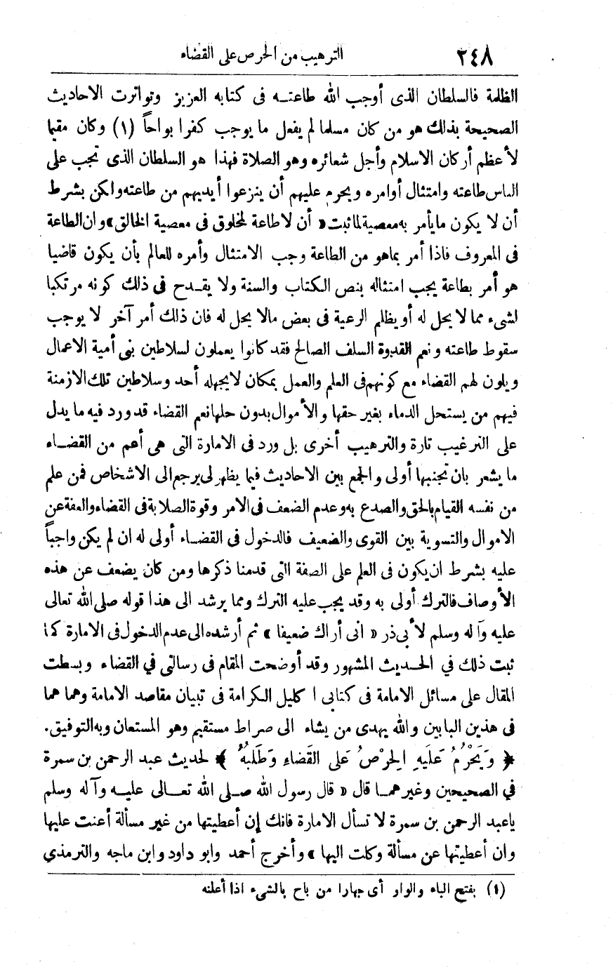 الظلمة فالسلطان الذي أوجب الله طاعته في كتابه العزيز وتوافرت الأحاديث الصحيحة بذلك هو من كان مسلما لم يفعل ما يوجب كفرا بواحا1 وكان مقيما لأعظم أركان الإسلام وأجل شعائره وهو الصلاة فهذا هو السلطان الذي تجب على الناس طاعته وامتثال أوامره ويحرم عليهم أن ينزعوا أيديهم في طاعته ولكن بشرط أن لا يكون ما يأمر به معصية لما ثبت "أن لا طاعة لمخلوق في معصية الخالق" وأن الطاعة في المعروف فإذا أمر بما هو من الطاعة وجب الامتثال وأمره للعالم بأن يكون قاضيا هو أمر بطاعة يجب امتثاله بنص الكتاب والسنة ولا يقدح في ذلك كونه مرتكبا لشئ مما لا يحل له أو يظلم الرعية في بعض ما لا يحل له فإن ذلك أمر آخر لا يوجب سقوط طاعته ونعم القدوة السلف الصالح فقد كانوا يعملون لسلاطين بني أمية الأعمال ويلون لهم القضاء مع كونهم في العلم والعمل بمكان لا يجهله أحد وسلاطين تلك الأزمنة فيهم من يستحل الدماء بغير حقها والأموال بدون حلها نعم القضاء قد ورد فيه ما يدل على الترغيب تارة والترهيب أخرى بل ورد في الإمارة التي هي أعم من القضاء ما يشعر بأن تجنبها أولى والجمع بين الأحاديث فيما يظهر لي يرجع إلى الأشخاص فمن علم من نفسه القيام بالحق والصدع به وعدم الضعف في الأمر وقوة الصلابة في القضاء والعفة عن الأموال والتسوية بين القوي والضعيف فالدخول في القضاء أولى له إن لم يكن واجبا عليه بشرط أن يكون في العلم على الصفة التي قدمنا ذكرها ومن كان يضعف عن هذه الأوصاف فالترك أولى به وقد يجب عليه الترك ومما يرشد إلى هذا قوله صلى الله تعالى عليه وآله وسلم لأبي ذر: "إني أراك ضعيفا" ثم أرشده إلى عدم الدخول في الإمارة كما ثبت ذلك في الحديث المشهور وقد أوضحت المقام في رسالتي في القضاء وبسطت المقال على مسائل الإمامة في كتابي إكليل الكرامة في تبيان مقاصد الإمامة وهما هما في هذين البابين والله يهدي من يشاء إلى صراط مستقيم وهو المستعان وبه التوفيق