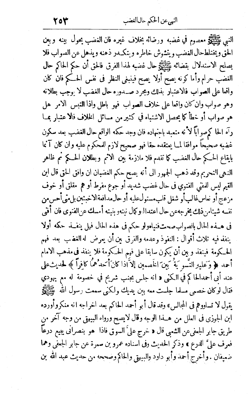 النبي صلى الله عليه وسلم معصوم في غضبه ورضائه بخلاف غيره فإن الغضب يحول بينه وبين الحق ويختلط حال الغضب ويتشوش خاطره ويتكدر ذهنه ويذهل عن الصواب فلا يصلح الاستدلال بقضائه صلى الله عليه وسلم حال غضبه لهذا الفرق فالحق أن حكم الحاكم حال الغضب حرام وأما كونه يصح أو لا يصح فينبغي النظر في نفس الحكم فإن كان واقعا على الصواب فالاعتبار بذلك ومجرد صدوره حال الغضب لا يوجب بطلانه وهو صواب وإن كان واقعا على خلاف الصواب فهو باطل وإذا التبس الأمر هل هو صواب أو خطأ كما يحصل الاشتباه في كثير من مسائل الخلاف فالاعتبار بما رآه الحاكم صوابا لأنه متعبد باجتهاده فإن وجد حكمه الواقع حال الغضب بعد سكون غضبه صحيحا موافقا لما يعتقده حقا فهو صحيح لازم للمحكوم عليه وإن كان آثما بإيقاع الحكم حال الغضب كما تقدم فلا ملازمة بين الإثم وبطلان الحكم ثم ظاهر النهي التحريم وقد ذهب الجمهور إلى أنه يصح حكم الغضبان أن وافق الحق قال ابن القيم: ليس للمفتي الفتوى في حال غضب شديد أو جوع مفرط أو هم مقلق أو خوف مزعج أو نعاس غالب أو شغل قلب مستول عليه أو حال مدافعة الأخبثين بل متى أحس منه نفسه شيئا من ذلك يخرجه عن حال اعتداله وكمال نيته وبنيته أمسك عن الفتوى فإن أفتى في هذه الحال بالصواب صحت فتياه ولو حكم في هذه الحال فهل ينفذ حكمه أولا ينفذ فيه ثلاثة أقوال: النفوذ وعدمه والفرق بين أن يعرض له الغضب بعد فهم الحكومة فينفذ وبين أن يكون سابقا على فهم الحكومة فلا ينفذ في مذهب الإمام أحمد "وعليه التسوية بين الخصمين إلا إذا كان أحدهما كافرا" لحديث علي عند أبي أحمد الحاكم في الكنى أنه جلس بجنب شريح في خصومة له مع يهودي فقال: لو كان خصمي مسلما جلست معه بين يديك ولكني سمعت رسول الله صلى الله عليه وسلم يقول: "لا تساووهم في المجالس" وقد قال أبو أحمد الحاكم بعد إخراجه إنه منكر وأورده ابن الجوزي في العلل من هذا الوجه وقال: لا يصح ورواه البيهقي من وجه آخر من طريق جابر الجعفي عن الشعبي قال: خرج علي إلى السوق فإذا هو بنصراني يبيع درعا فعرف علي الدرع وذكر الحديث وفي إسناده عمرو بن سمرة عن جابر الجعفي وهما ضعيفان وأخرج أحمد وأبو داود والبيهقي والحاكم وصححه من حديث عبد الله بن