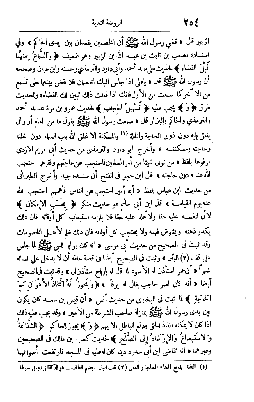 الزبير قال: "قضى رسول الله صلى الله عليه وسلم أن الخصمين يقعدان بين يدي الحاكم" وفي إسناده مصعب بن ثابت عن عبد الله بن الزبير وهو ضعيف "والسماع منهما قبل القضاء" لحديث علي عند أحمد وأبي داود والترمذي وحسنه وابن حبان وصححه أن رسول الله صلى الله عليه وسلم قال: "يا علي إذا جلس إليك الخصمان فلا تقض بينهما حتى تسمع من الآخر كما سمعت من الأول فإنك إذا فعلت ذلك تبين لك القضاء " وللحديث طرق "و" يجب عليه "تسهيل الحجاب" لحديث عمرو بن مرة عند أحمد والترمذي والحاكم والبزار قال: سمعت رسول الله صلى الله عليه وسلم يقول: "ما من إمام أو وال يغلق بابه دون ذوي الحاجة والخلة1 والمسكنة إلا غلق الله باب السماء دون خلته وحاجته ومسكنته" وأخرج أبو داود والترمذي من حديث أبي مريم الأزدي مرفوعا بلفظ "من تولى شيئا من أمر المسلمين فاحتجب عن حاجتهم وفقرهم احتجب الله عنه دون حاجته" قال ابن حجر في الفتح: إن سنده جيد وأخرج الطبراني من حديث ابن عباس بلفظ "أيما أمير احتجب عن الناس فأهمهم احتجب الله عنه يوم القيامة" قال ابن أبي حاتم هو حديث منكر "بحسب الإمكان" لأنه لنفسه عليه حقا ولأهله عليه حقا فلا يلزمه استيعاب كل أوقاته فإن ذلك يكدر ذهنه ويشوش فهمه ولا يحتجب كل أوقاته فإن ذلك ظلم لأهل الخصومات وقد ثبت في الصحيح من حديث أبي موسى أنه كان بوابا للنبي صلى الله عليه وسلم لما جلس على قف2 البئر وثبت في الصحيح أيضا في قصة حلفه أن لا يدخل على نسائه شهرا "أن عمر استأذن له الأسود لما قال له يا رباح استأذن لي "وقد ثبت في الصحيح أيضا "أنه كان لعمر حاجب يقال له يرفأ "ويجوز له اتخاذ الأعوان مع الحاجة" لما ثبت في البخاري من حديث أنس "أن قيس بن سعد كان يكون بين يدي رسول الله صلى الله عليه وسلم بمنزلة صاحب الشرطة من الأمير "وقد يجب عليه ذلك إذا كان لا يمكنه إنفاذ الحق ودفع الباطل إلا بهم "و" يجوز للحاكم "الشفاعة والاستيضاع والإرشاد إلى الصلح" لحديث كعب بن مالك في الصحيحين وغيرهما "أنه تقاضى ابن أبي حدرد دينا كان له عليه في المسجد فارتفعت أصواتهما"