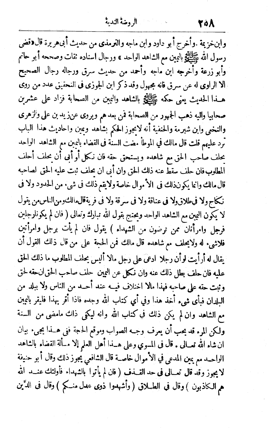 وابن خزيمة وأخرجه أبو داود وابن ماجه والترمذي من حديث أبي هريرة قال:" قضى رسول الله صلى الله عليه وسلم باليمين مع الشاهد الواحد"ورجال إسناده ثقات وصححه أبو حاتم وأبو زرعة وأخرجه ابن ماجه وأحمد من حديث سرق ورجاله رجال الصحيح إلا الراوي له عن سرق فإنه مجهول وقد ذكر ابن الجوزي في التحقيق عدد من روى هذا الحديث يعني حكمه صلى الله عليه وسلم بالشاهد واليمين من الصحابة فزاد على عشرين صحابيا وإليه ذهب الجمهور من الصحابة فمن بعدهم ويروى عن زيد بن علي والزهري والنخعي وابن شبرمة والحنفية أنه لا يجوز الحكم بشاهد ويمين وأحاديث هذا الباب ترد عليهم قلت: قال مالك في الموطأ مضت السنة في القضاء باليمين مع الشاهد الواحد يحلف صاحب الحق مع شاهده ويستحق حقه فإن نكل أو أبى أن يحلف أُحلف المطلوب فإن حلف سقط عنه ذلك الحق وإن أبى أن يحلف ثبت عليه الحق لصاحبه قال مالك: وإنما يكون ذلك في الأموال خاصة ولا يقع ذلك في شئ من الحدود ولا في نكاح ولا في طلاق ولا في عتاقة ولا في سرقة ولا في فرية قال مالك: ومن الناس من يقول لا يكون اليمين مع الشاهد الواحد ويحتج بقول الله تبارك وتعالى {فَإِنْ لَمْ يَكُونَا رَجُلَيْنِ فَرَجُلٌ وَامْرَأَتَانِ مِمَّنْ تَرْضَوْنَ مِنَ الشُّهَدَاءِ} يقول: فإن لم يأت برجل وامرأتين فلا شئ له ولا يحلف مع شاهده قال مالك: فمن الحجة على من قال ذلك القول أن يقال له أرأيت لو أن رجلا ادعى على رجل مالا أليس يحلف المطلوب ما ذلك الحق عليه فإن حلف بطل ذلك عنه وإن نكل عن اليمين حلف صاحب الحق إن حقه لحق وثبت حقه على صاحبه فهذا مالا اختلاف فيه عند أحد من الناس ولا ببلد من البلدان فبأي شئ أخذ هذا وفي أي كتاب الله وجده فإذا أقر بهذا فليقر باليمين مع الشاهد وإن لم يكن ذلك في كتاب الله وإنه ليكفي ذلك ما مضى من السنة ولكن المرء قد يحب أن يعرف وجه الصواب وموقع الحجة ففي هذا يجيء بيان إن شاء الله تعالى قال في المسوى: وعلى هذا أهل العلم إلا مسألة القضاء بالشاهد الواحد مع يمين المدعي في الأموال خاصة قال الشافعي: يجوز ذلك وقال أبو حنيفة: لا يجوز وقد قال تعالى في حد القذف: {لَوْلا جَاءُوا عَلَيْهِ بِأَرْبَعَةِ شُهَدَاءَ فَإِذْ لَمْ يَأْتُوا بِالشُّهَدَاءِ فَأُولَئِكَ عِنْدَ اللَّهِ هُمُ الْكَاذِبُونَ} وقال في الطلاق: {وَأَشْهِدُوا ذَوَيْ عَدْلٍ مِنْكُمْ} وقال في الدَّين: