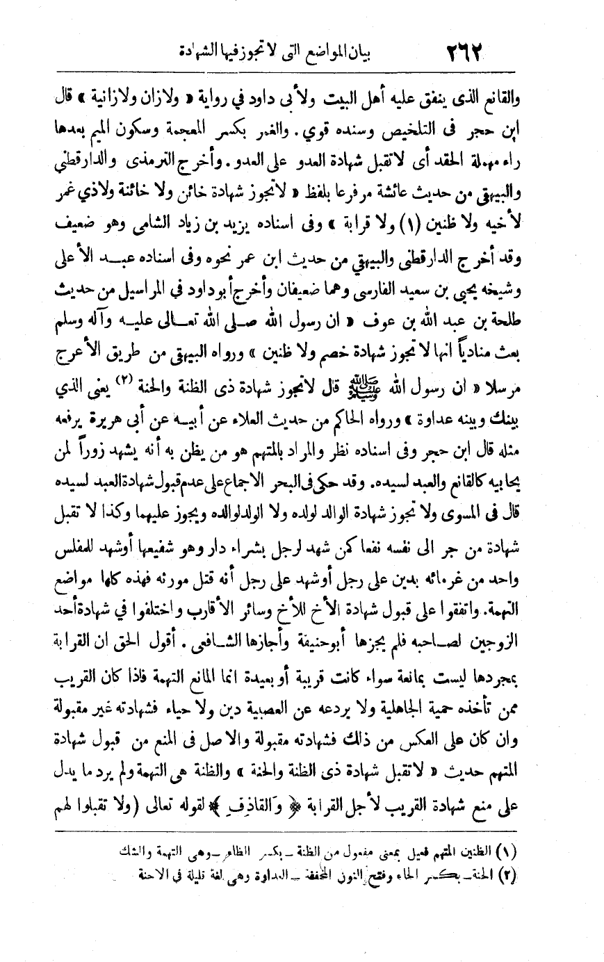 والقانع الذي ينفق عليه أهل البيت ولأبي داود في رواية "ولا زان ولا زانية" قال ابن حجر في التلخيص: وسنده قوي والغمر بكسر المعجمة وسكون الميم بعدها راء مهملة الحقد أي لا تقبل شهادة العدو على العدو وأخرج الترمذي والدارقطني والبيهقي من حديث عائشة مرفوعا بلفظ "لا تجوز شهادة خائن ولا خائنة ولا ذي غمر لأخيه ولا ظنين1 ولا قرابة" وفي إسناده يزيد بن زياد الشافعي وهو ضعيف وقد أخرج الدارقطني والبيهقي من حديث ابن عمر نحوه وفي إسناده عبد الأعلى وشيخه يحيى بن سعيد الفارسي وهما ضعيفان وأخرج أبو داود في المراسيل من حديث طلحة بن عبد الله بن عوف "أن رسول الله صلى الله تعالى عليه وآله وسلم بعث مناديا أنها لا تجوز شهادة خصم ولا ظنين"ورواه البيهقي من طريق الأعرج مرسلا أن رسول الله صلى الله عليه وسلم قال: "لا تجوز شهادة ذي الظنة والحنة2 يعني الذي بينك وبينه عداوة"ورواه الحاكم من حديث العلاء عن أبيه عن أبي هريرة يرفعه مثله قال ابن حجر: وفي إسناده نظر والمراد بالمتهم هو من يظن به أنه يشهد زورا لمن يحابيه كالقانع والعبد لسيده وقد حكى في البحر الإجماع على عدم قبول شهادة العبد لسيده قال في المسوى: ولا تجوز شهادة الوالد لولده ولا الولد لوالده ويجوز عليهما وكذا لا تقبل شهادة من جر إلى نفسه نفعا كمن شهد لرجل بشراء دار وهو شفيعها أو شهد للمفلس واحد من غرمائه بدين على رجل أو شهد على رجل أنه قتل مورثه فهذه كلها مواضع التهمة واتفقوا على قبول شهادة الأخ للأخ وسائر الأقارب واختلفوا في شهادة أحد الزوجين لصاحبه فلم يجزها أبو حنيفة وأجازها الشافعي أقول: الحق أن القرابة بمجردها ليست بمانعة سواء كانت قريبة أو بعيدة إنما المانع التهمة فإذا كان القريب ممن تأخذه حمية الجاهلية ولا يردعه عن العصبية دين ولا حياء فشهادته غير مقبولة وإن كان على العكس من ذلك فشهادته مقبولة والأصل في المنع من قبول شهادة المتهم حديث "لا تقبل شهادة ذي الظنة والحنة" والظنة هي التهمة ولم يرد ما يدل على منع شهادة القريب لأجل القرابة "والقاذف" لقوله تعالى: {وَلا تَقْبَلُوا لَهُمْ