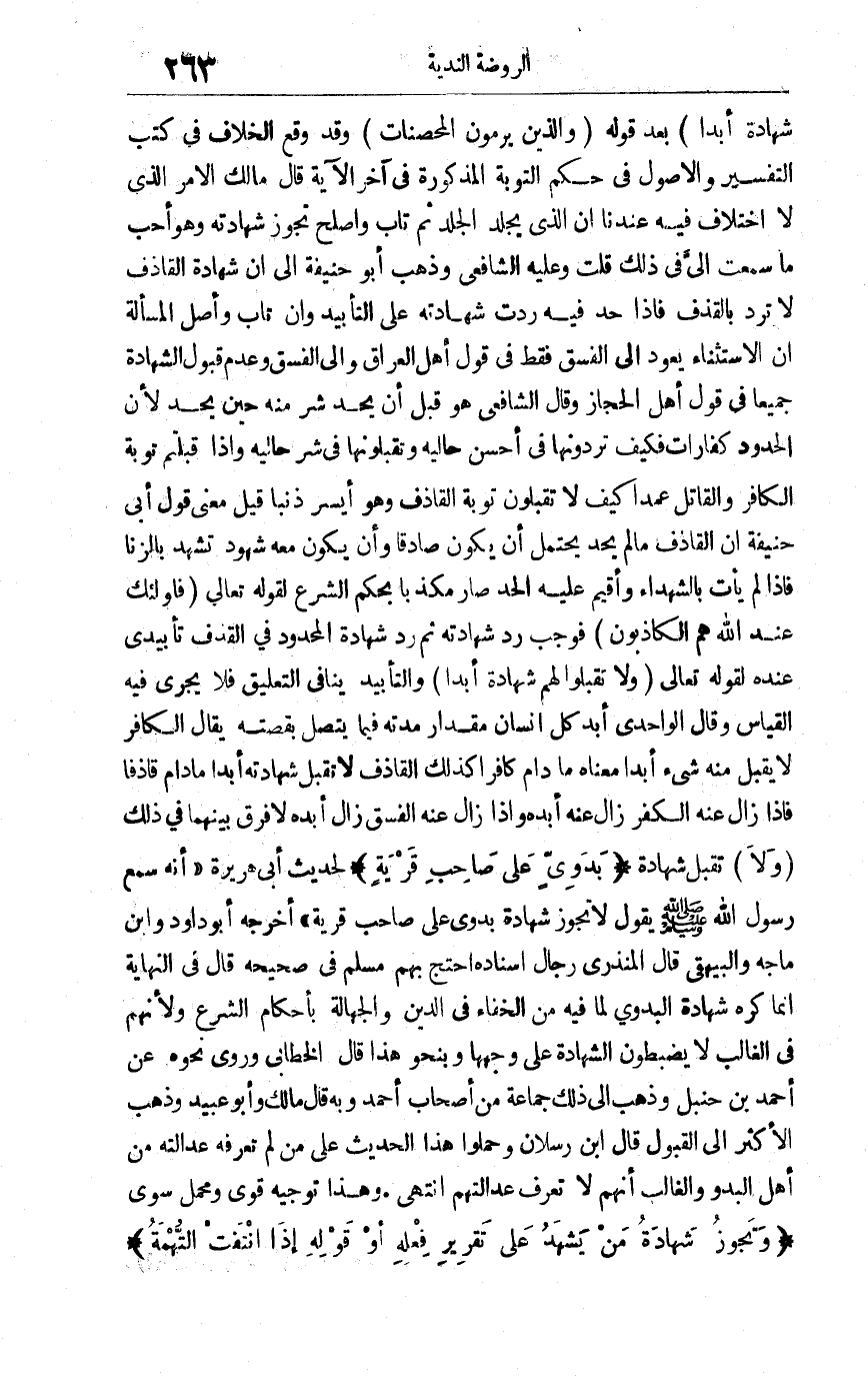 شَهَادَةً أَبَداً} بعد قوله: {وَالَّذِينَ يَرْمُونَ الْمُحْصَنَاتِ} وقد وقع الخلاف في كتب التفسير والأصول في حكم التوبة المذكورة في آخر الآية قال مالك: الأمر الذي لا اختلاف فيه عندنا أن الذي يجلد الجلد ثم تاب وأصلح تجوز شهادته وهو أحب ما سمعت إلي في ذلك قلت: وعليه الشافعي وذهب أبو حنيفة إلى أن شهادة القاذف لا ترد بالقذف فإذا حد فيه ردت شهادته على التأبيد وإن تاب وأصل المسألة أن الاستثناء يعود إلى الفسق فقط في قول أهل العراق وإلى الفسق وعدم قبول الشهادة جميعا في قول أهل الحجاز وقال الشافعي: هو قبل أن يحد شر منه حين يحد لأن الحدود كفارات فكيف ترودنها في أحسن حاليه وتقبلونها في شر حاليه وإذا قبلتم توبة الكافر والقاتل عمدا كيف لاتقبلون توبة القاذف وهو أيسر ذنبا قيل: معنى قول أبي حنيفة أن القاذف ما لم يحد يحتمل أن يكون صادقا وأن يكون معه شهود تشهد بالزنا فإذا لم يأت بالشهداء وأقيم عليه الحد صار مكذبا بحكم الشرع لقوله تعالى: {فَأُولَئِكَ عِنْدَ اللَّهِ هُمُ الْكَاذِبُونَ} فوجب رد شهادته ثم رد شهادة المحدود في القذف تأبيدي عنده لقوله تعالى: {وَلا تَقْبَلُوا لَهُمْ شَهَادَةً أَبَداً} والتأبيد ينافي التعليق فلا يجري فيه القياس وقال الواحدي: أبد كل إنسان مقدار مدته فيما يتصل بقصته يقال: الكافر لا يقبل منه شئ أبدا معناه ما دام كافرا كذلك القاذف لا تقبل شهادته أبدا ما دام قاذفا فإذا زال عنه الكفر أبده وإذا زال عنه الفسق زال أبده لا فرق بينهما في ذلك "ولا" تقبل شهادة "بدوي على صاحب قرية" لحديث أبي هريرة أنه سمع رسول الله صلى الله عليه وسلم يقول: "لاتجوز شهادة بدوي على صاحب قرية " أخرجه أبو داود وابن ماجه والبيهقي قال المنذري: رجال إسناده احتج بهم مسلم في صحيحه قال في النهاية: إنما كره شهادة البدوي لما فيه من الخفاء في الدين والجهالة بأحكام الشرع ولأنهم في الغالب لا يضبطون الشهادة على وجهها وبنحو هذا قال الخطابي وروي نحوه عن أحمد بن حنبل وذهب إلى ذلك جماعة من أصحاب أحمد وبه قال مالك وأبو عبيد وذهب الأكثر إلى القبول قال ابن رسلان: وحملوا هذا الحديث على من لم تعرف عدالته من أهل البدو والغالب أنهم لا تعرف عدالتهم انتهى. وهذا توجيه قوي ومحمل سوي "وتجوز شهادة من يشهد على تقرير فعله أو قوله إذا انتفت التهمة"