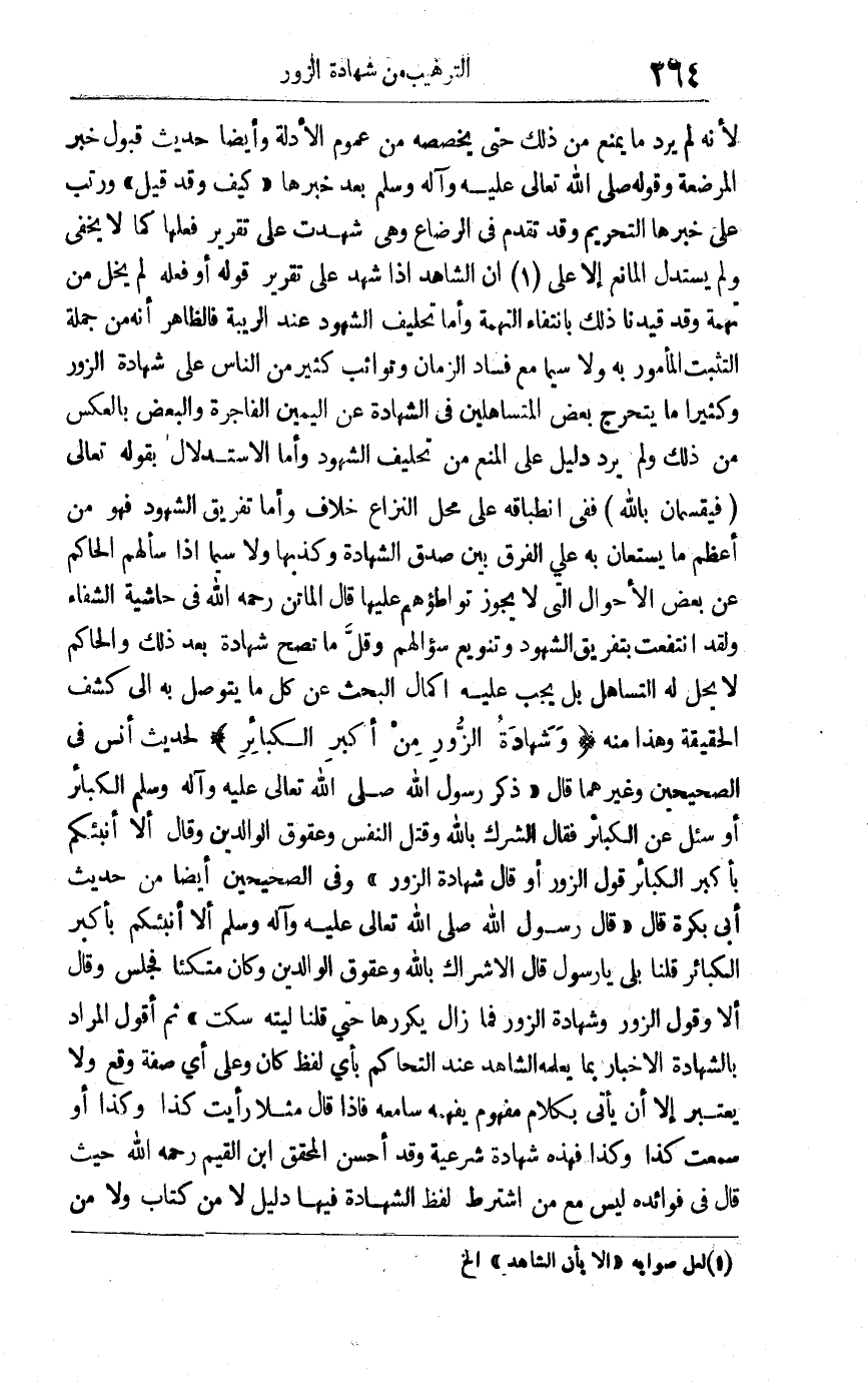 لأنه لم يرد ما يمنع من ذلك حتى يخصصه من عموم الأدلة وأيضا حديث قبول خبر المرضعة وقوله صلى الله تعالى عليه وآله وسلم بعد خبرها "كيف وقد قيل "ورتب على خبرها التحريم وقد تقدم في الرضاع وهي شهدت على تقرير فعلها كما لا يخفى ولم يستدل المانع إلا على1 أن الشاهد إذا شهد على تقرير قوله أو فعله لم يخل من تهمة وقد قيدنا ذلك بانتفاء التهمة وأما تحليف الشهود عند الريبة فالظاهر أنه من جملة التثبيت المأمور به ولا سيما مع فساد الزمان وتواثب كثير من الناس على شهادة الزور وكثيرا ما يتحرج بعض المتساهلين في الشهادة عن اليمين الفاجرة والبعض بالعكس من ذلك ولم يرد ذلك على المنع من تحليف الشهود وأما الاستدلال بقوله تعالى {فَيُقْسِمَانِ بِاللَّهِ} ففي انطباقه على محل النزاع خلاف وأما تفريق الشهود فهو من أعظم ما يستعان به على الفرق بين صدقة الشهادة وكذبها ولا سيما إذا سألهم الحاكم عن بعض الأحوال التي تجوز تواطؤهم عليها قال الماتن رحمه الله في حاشية الشفاء: ولقد انتفعت بتفريق الشهود وتنويع سؤالهم وقل ما تصح شهادة بعد ذلك والحاكم لا يحل له التساهل بل يجب عليه إكمال البحث عن كل ما يتوصل به إلى كشف الحقيقة وهذا منه "وشهادة الزور من أكبر الكبائر" لحديث أنس في الصحيحين وغيرهما قال: ذكر رسول الله صلى الله تعالى عليه وآله وسلم الكبائر أو سئل عن الكبائر فقال: "الشرك بالله وقتل النفس وعقوق الوالدين" وقال: "ألا أنبئكم بأكبر الكبائر قول الزور أو قال شهادة الزور" وفي الصحيحين أيضا من حديث أبي بكرة قال: قال رسول الله صلى الله تعالى عليه وآله وسلم: "ألا أنبئكم بأكبر الكبائر" قلنا بلى يارسول قال: "الإشراك بالله وعقوق الوالدين" وكان متكئا فجلس وقال: "ألا وقول الزور وشهادة الزور فما زال يكررها حتى قلنا ليته سكت" ثم أقول: المراد بالشهادة الإخبار بما يعلمه الشاهد عند التحاكم بأي لفظ كان وعلى أي صفة وقع ولا يعتبر إلا أن يأتي بكلام مفهوم يفهمه سامعه فإذا قال مثلا رأيت كذا وكذا أو سمعت كذا وكذا فهذه شهادة شرعية وقد أحسن المحقق ابن القيم رحمه الله حيث قال في فوائده: ليس مع من اشترط لفظ الشهادة فيها دليل لا من كتاب ولا من
