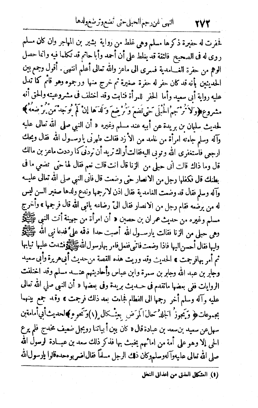 فحفرت له حفيرة ذكرها مسلم وهي غلط من رواية بشير بن المهاجر وإن كان مسلم روى له في الصحيح فالثقة قد يغلط على أن أحمد وأبا حاتم قد تكلما فيه وإنما حصل الوهم من حفرة الغامدية فسرى إلى ماعز والله تعالى أعلم انتهى أقول: وجمع بين الحديثين بأنه فد كان حفر له حفرة صغيرة ثم خرج منها ورجموه وهو قائم كما تدل عليه رواية أبي سعيد وأما الحفر للمرأة فثابت وقد اختلف في مشروعيته والحق أنه مشروع "ولا ترجم الحبلى حتى تضع وترضع ولدها إن لم يوجد من يرضعه" لحديث سليمان بن بريدة عن أبيه عند مسلم وغيره أن النبي صلى الله تعالى عليه وآله وسلم جاءته امرأة من غامد من الأزد فقال طهرني يارسول الله فقال: "ويحك ارجعي فاستغفري الله وتوبي إليه" فقالت: أراك تريد أن تردني كما رددت ماعز بن مالك قال: "وما ذاك" قالت: إني حبلى من الزنا قال: أنت؟ " قالت: نعم فقال لها "حتى تضعي ما في بطنك" قال: فكفلها رجل من الأنصار حتى وضعت قال فأتى النبي صلى الله تعالى عليه وآله وسلم فقال: قد وضعت الغامدية فقال: "إذن لا نرجمها وندع ولدها صغير السن ليس له من يرضعه" فقام رجل من الأنصار فقال: إلي رضاعه يا نبي الله قال "فارجمها" وأخرج مسلم وغيره من حديث عمران ابن حصين "أن امرأة جهينة أتت النبي صلى الله عليه وسلم وهي حبلى من الزنا فقالت: يارسول الله أصبت حدا فأقمه علي فدعا نبي الله صلى الله عليه وسلم وليها فقال: "أحسن إليها فإذا وضعت فأتني" ففعل فأمر بها رسول الله صلى الله عليه وسلم فشدت عليها ثيابها ثم أمر بها فرجمت" الحديث وقد رويت هذه القصة من حديث أبي هريرة وأبي سعيد وجابر بن عبد الله وجابر بن سمرة وابن عباس وأحاديثهم عند مسلم وقد اختلفت الروايات ففي بعضها ما تقدم في حديث بريدة وفي بعضها "أن النبي صلى الله تعالى عليها وآله وسلم أخر رجمها إلى الفطام فجاءت بعد ذلك فرجمت"وقد جمع بينهما مجموعات "ويجوز الجلد حال المرض بعثكال ونحوه1" لحديث أبي أمامة بن سهل عن سعيد بن سعد بن عبادة قال: "كان بين أبياتنا رويجل ضعيف مخدج فلم يرع الحي إلا وهو على أمة من إمائهم يخبث بها فذكر ذلك سعد بن عبادة لرسول الله صلى الله تعالى عليه وآله وسلم وكان ذلك الرجل مسلما فقال: اضربوه حده قالوا يا رسول الله: