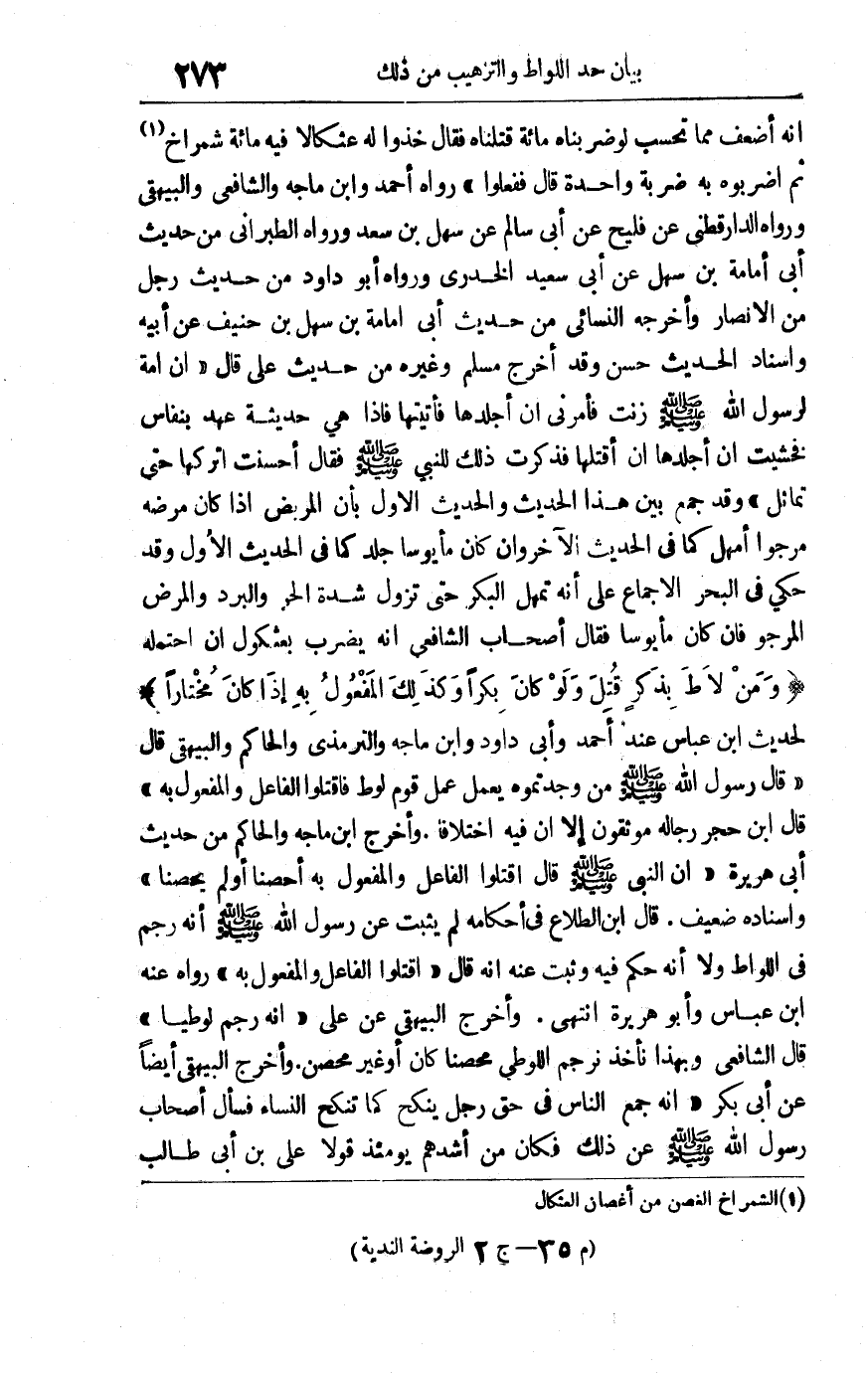 إنه أضعف مما تحسب لو ضربناه مائة قتلناه فقال: خذوا له عثكالا فيه مائة شمراخ1 ثم اضربوه به ضربة واحدة قال: ففعلوا "وراه أحمد وابن ماجه والشافعي والبيهقي ورواه الدارقطني عن فليح عن أبي سالم عن سهل بن سعد ورواه الطبراني من حديث أبي أمامة بن سهل عن أبي سعيد الخدري ورواه أبو داود من حديث رجل من الأنصار وأخرجه النسائي من حديث أبي أمامة بن سهل بن حنيف عن أبيه وإسناد الحديث حسن وقد أخرج مسلم وغيره من حديث علي قال: إن أمة لرسول الله صلى الله عليه وسلم زنت فأمرني أن أجلدها فأتيتها فإذا هي حديثة عهد بنفاس فخشيت أن أجلدها أن أقتلها فذكرت ذلك للنبي صلى الله عليه وسلم فقال: "أحسنت اتركها حتى تماثل" وقد جمع بين هذا الحديث والحديث الأول بأن المريض إذا كان مرضه مرجوا أمهل كما في الحديث الآخر وإن كان مأيوسا جلد كما في الحديث الأول وقد حكى في البحر الإجماع على أنه تمهل البكر حتى تزول شدة الحر والبرد والمرض المرجو فإن كان مأيوسا فقال أصحاب الشافعي: إنه يضرب بعثكول إن احتمله "ومن لاط بذكر قتل ولو كان بكرا وكذلك المفعول به إذا كان مختارا" لحديث ابن عباس عند أحمد وأبي داود وابن ماجه والترمذي والحاكم والبيهقي قال: قال رسول الله صلى الله عليه وسلم: "من وجدتموه يعمل عمل قوم لوط فاقتلوا الفاعل والمفعول به" قال ابن حجر: رجاله موثقون إلا أن فيه اختلافا وأخرج ابن ماجه والحاكم من حديث أبي هريرة أن النبي صلى الله عليه وسلم قال: "اقتلوا الفاعل والمفعول به أحصنا أولم يحصنا" وإسناده ضعيف قال ابن الطلاع في أحكامه لم يثبت عن رسول الله صلى الله عليه وسلم أنه رجم في اللواط ولا أنه حكم فيه وثبت عنه أنه قال: "اقتلوا الفاعل والمفعول به" رواه عنه ابن عباس وأبو هريرة انتهى وأخرج البيهقي عن علي "أنه رجم لوطيا" قال الشافعي: وبهذا نأخذ نرجم اللوطي محصنا كان أو غير محصن وأخرج البيهقي أيضا عن أبي بكر أنه جمع الناس في حق رجل ينكح كما تنكح النساء فسأل أصحاب رسول الله صلى الله عليه وسلم عن ذلك فكان من أشدهم يومئذ قولا علي ابن أبي طالب