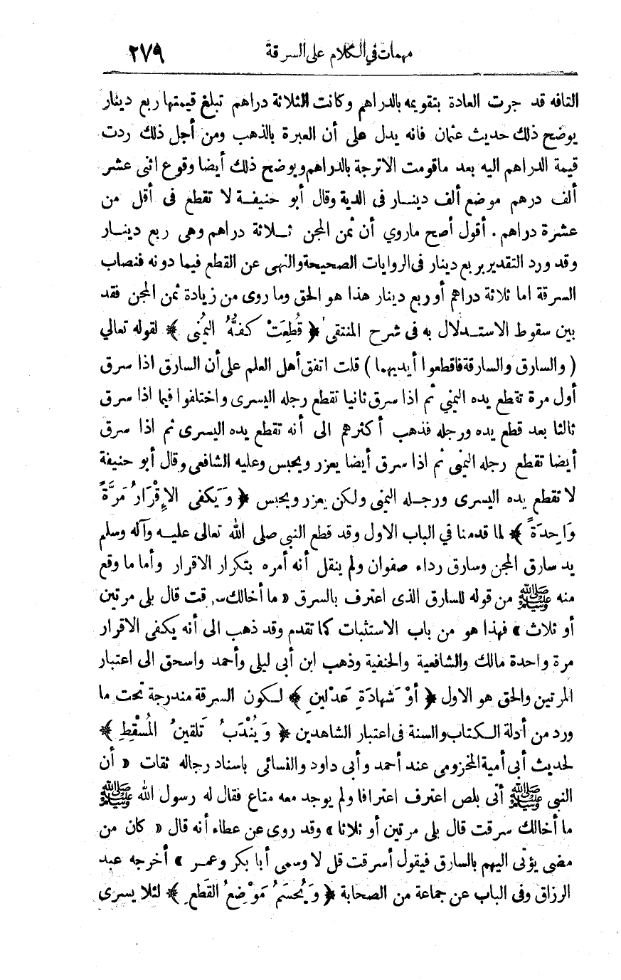 التافه قد جرت العادة بتقويمه بالدراهم وكانت الثلاثة دراهم تبليغ قيمتها ربع دينار يوضح ذلك حديث عثمان فإنه يدل على أن العبرة بالذهب ومن أجل ذلك ردت قيمة الدراهم إليه بعد ما قومت الأترجة بالدراهم ويوضح ذلك أيضا وقوع اثني عشر ألف درهم موضع ألف دينار في الدية وقال أبو حنيفة: لا تقطع في أقل من عشرة دراهم أقول: أصح ما روي أن ثمن المجن ثلاثة دراهم وهي ربع دينار وقد ورد التقدير بربع دينار في الروايات الصحيحة والنهي عن القطع فيما دونه فنصاب السرقة إما ثلاثة دراهم أو ربع دينار هذا هو الحق وما روي من زيادة ثمن المجن فقد بين سقوط الاستدلال به في شرح المنتقى