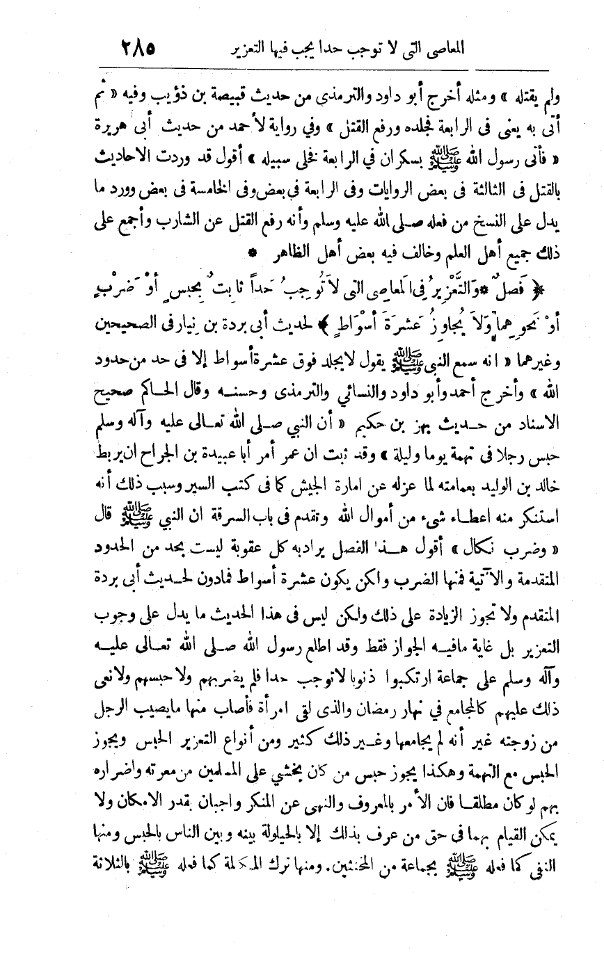 "فصل والتعزير في المعاصي التي لا توجب حدا ثابت بحبس أو ضرب أو نحوهما ولا يجاوز عشرة أسواط" لحديث أبي بردة بن نيار في الصحيحين وغيرهما أنه سمع النبي صلى الله عليه وسلم يقول: " لا يجلد فوق عشرة أسواط إلا في حد من حدود الله" وأخرج أحمد وأبو داود والنسائي والترمذي وحسنه وقال الحاكم: صحيح الإسناد من حديث بهز بن حكيم "أن النبي صلى الله تعالى عليه وآله وسلم حبس رجلا في تهمة يوما وليلة" وقد ثبت أن عمر أمر أبا عبيدة بن الجراح أن يربط خالد بن الوليد بعمامته لما عزله عن إمارة الجيش كما في كتب السير وسبب ذلك أنه استنكر منه إعطاء شئ من أموال الله وتقدم في باب السرقة أن النبي صلى الله عليه وسلم قال: "وضرب نكال " أقول: هذا الفصل يراد به كل عقوبة ليست بحد من الحدود المتقدمة والآتية فمنها الضرب ولكن يكون عشرة أسواط فما دون لحديث أبي بردة المتقدم ولا تجوز الزيادة على ذلك ولكن ليس في هذا الحديث مايدل على وجوب التعزيز بل غاية ما فيه الجواز فقط وقد اطلع رسول الله صلى الله تعالى عليه وآله وسلم على جماعة ارتكبوا ذنوبا لا توجب حدا فلم يضربهم ولا حبسهم ولا نعى ذلك عليهم كالمجامع في نهار رمضان والذي لقي امرأة فأصاب منها ما يصب الرجل من زوجته غير أنه لم يجامعها وغير ذلك كثير ومن أنواع التعزير الحبس ويجوز الحبس مع التهمة وهكذا يجوز حبس من كان يخشى على المسلمين معرته وإضراره بهم لو كان مطلقا فإن الأمر بالمعروف والنهي عن المنكر واجبان بقد الإمكان ولا يمكن القيام بهما في حق من عرف بذلك إلا بالحيلولة بينه وبين الناس بالحبس ومنها النفي كما فعله صلى الله عليه وسلم بجماعة من المخنثين. ومنها ترك المكلمة كما فعله صلى الله عليه وسلم بالثلاثة