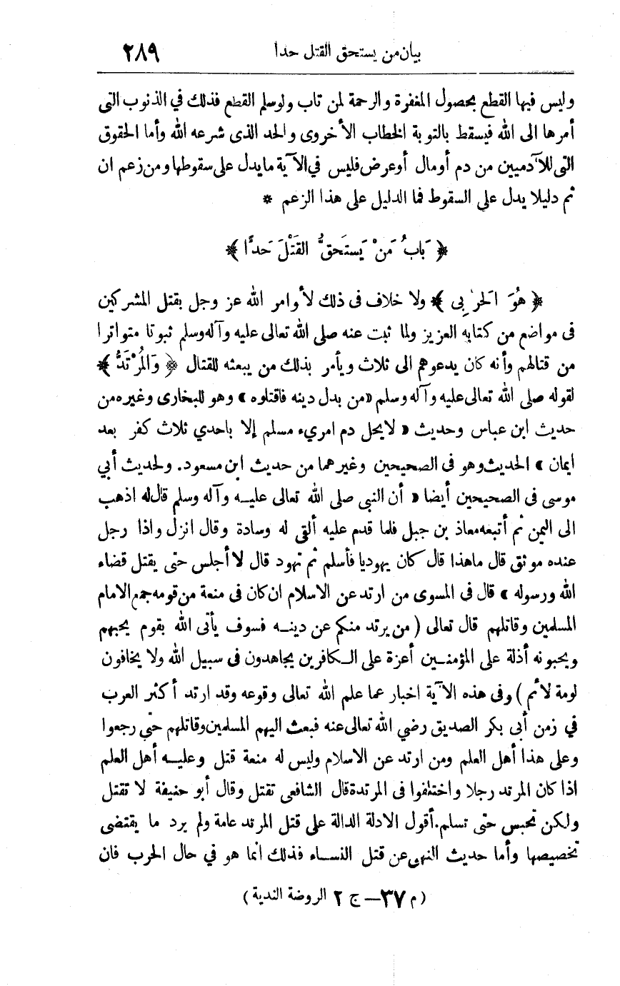 "هو الحربي" ولا خلاف في ذلك لأوامر الله عز وجل بقتل المشركين في مواضع من كتابه العزيز ولما ثبت عنه صلى الله تعالى عليه وآله وسلم ثبوتا متواترا من قتالهم وأنه كان يدعوهم إلى ثلاث ويأمر بذلك من يبعثه للقتال والمرتد لقوله صلى الله تعالى عليه وآله وسلم: "من بدل دينه فاقتلوه" وهو للبخاري وغيره من حديث ابن عباس وحديث "لا يحل دم امريء مسلم إلا بإحدى ثلاث كفر بعد إيمان" الحديث وهو في الصحيحين وغيرهما من حديث ابن مسعود وحديث أبي موسى في الصحيحين أيضا "أن النبي صلى الله تعالى عليه وآله وسلم قال له: "اذهب إلى اليمن" ثم أتبعه معاذ بن جبل فلما قدم عليه ألقى له وسادة وقال: انزل وإذا جاء رجل عنده موثق قال: ما هذا؟ قال: كان يهوديا فأسلم ثم تهود قال: لا أجلس حتى يقتل قضاء لله ورسوله "قال في المسوى: من ارتد عن الإسلام إن كان في منعة من قومه جمع الإمام المسلمين وقاتلهم قال تعالى: {مَنْ يَرْتَدَّ مِنْكُمْ عَنْ دِينِهِ فَسَوْفَ يَأْتِي اللَّهُ بِقَوْمٍ يُحِبُّهُمْ وَيُحِبُّونَهُ أَذِلَّةٍ عَلَى الْمُؤْمِنِينَ أَعِزَّةٍ عَلَى الْكَافِرِينَ يُجَاهِدُونَ فِي سَبِيلِ اللَّهِ وَلا يَخَافُونَ لَوْمَةَ لائِمٍ} وفي هذا الآية إخبار عما علم الله تعالى وقوعه وقد ارتد أكثر العرب في زمن أبي بكر الصديق رضي الله تعالى عنه فبعث إليهم المسلمين وقاتلهم حتى رجعوا وعلى هذا أهل العلم ومن ارتد عن الإسلام وليس له منعة قتل وعليه أهل العلم وإذا كان المرتد رجلا واختلفوا في المرتدة قال الشافعي: تقتل وقال أبو حنيفة: لا تقتل ولكن تحبس حتى تسلم