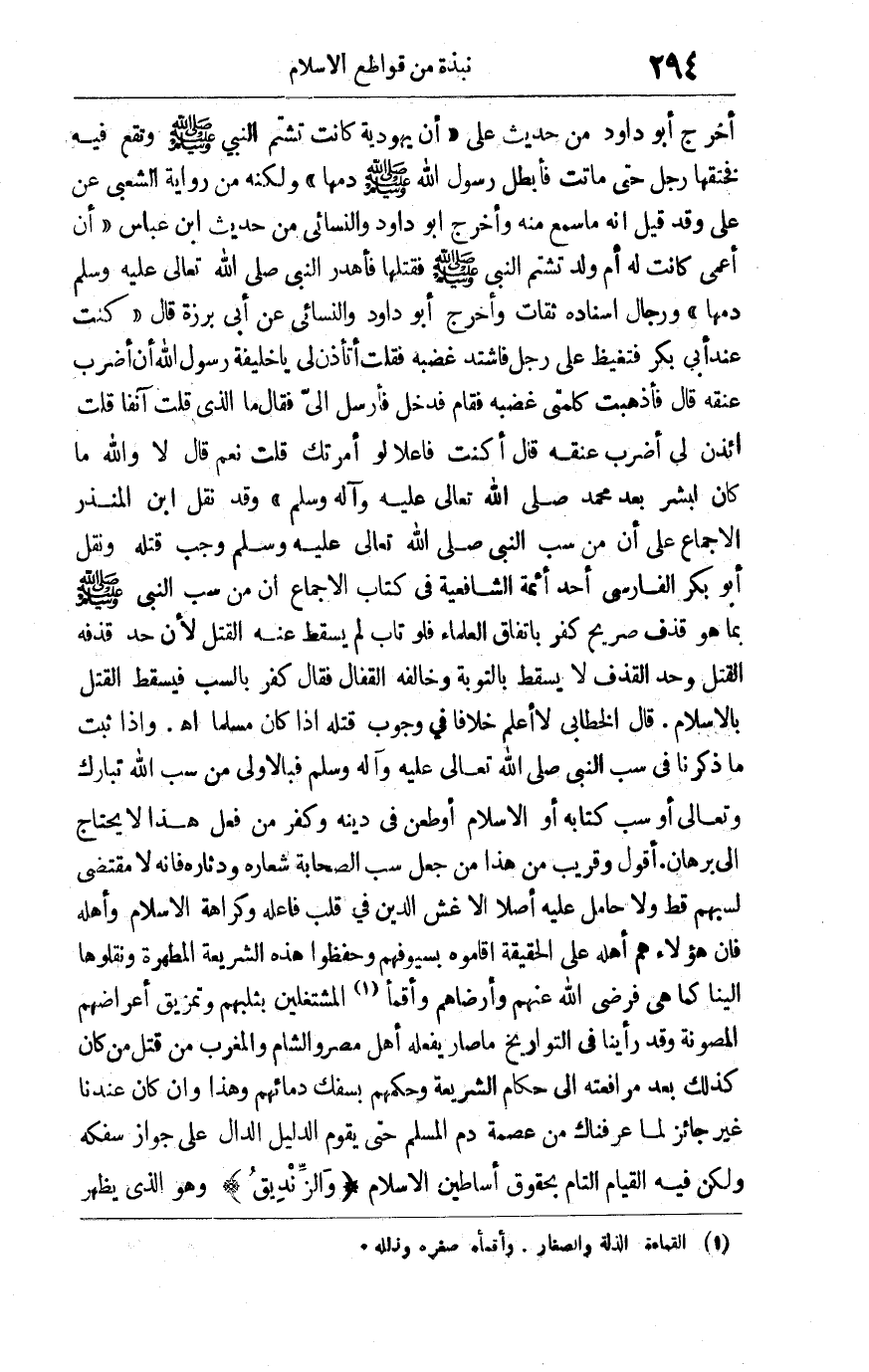 أخرج أبو داود من حديث علي "أن يهودية كانت تشتم النبي صلى الله عليه وسلم وتقع فيه فخنقها رجل حتى ماتت فأبطل رسول الله صلى الله عليه وسلم دمها" ولكنه من رواية الشعبي عن علي وقد قيل إنه ما سمع منه وأخرج أبو داود والنسائي من حديث ابن عباس "أن أعمى كانت له أم ولد تشتم النبي صلى الله عليه وسلم فقتلها فأهدر النبي صلى الله تعالى عليه وآله وسلم دمها" ورجال إسناده ثقات وأخرج أبو داود والنسائي عن أبي برزة قال: "كنت عند أبي بكر فتغيظ علي رجل فاشتد غضبه فقلت: أتأذن لي يا خليفة رسول الله أن أضرب عنقه قال: فأذهبت كلمتي غضبه فقام فدخل فأرسل إلي فقال: ما الذي قلت آنفا قلت: ائذن لي أضرب عنقه قال: أكنت فاعلا لو أمرتك قلت نعم قال: لا والله ما كان لبشر بعد محمد صلى الله تعالى عليه وآله وسلم" وقد نقل ابن المنذر الإجماع على أن من سب النبي صلى الله تعالى عليه وآله وسلم وجب قتله ونقل أبو بكر الفارسي أحد أئمة الشافعية في كتاب الإجماع أن من سب النبي صلى الله عليه وسلم بما هو قذف صريح كفر باتفاق العلماء فلو تاب لم يسقط عنه القتل لأن حد قذفه القتل وحد القذف لا يسقط بالتوبة وخالفه القفال فقال: كفر بالسب فيسقط القتل بالإسلام قال الخطابي: لا أعلم خلافا في وجوب قتله إذا كان مسلما اهـ وإذا ثبت ما ذكرنا في سب النبي صلى الله تعالى عليه وآله وسلم فبالأولى من سب الله تبارك وتعالى أو سب كتابه أو الإسلام أو طعن في دينه وكفر من فعل هذا لا يحتاج إلى برهان أقول: وقريب من هذا من جعل سب الصحابة شعاره ودثاره فإنه لا مقتضى لسبهم قط ولا حامل عليه أصلا إلا غش الدين في قلب فاعله وكراهة الإسلام وأهله فإن هؤلاء هم أهله على الحقيقة أقاموه بسيوفهم وحفظوا هذه الشريعة المطهرة ونقلوها إلينا كما هي فرضي الله عنهم وأرضاهم وأقمأ1 المشتغلين بثلبهم وتمزيق أعراضهم المصونة وقد رأينا في التواريخ ما صار يفعله أهل الشام والمغرب من قتل من كان كذلك بعد مرافعته إلى حكام الشريعة وحكمهم بسفك دمائهم وهذا وإن كان عندنا غير جائز لما عرفناك من عصمة دم المسلم حتى يقوم الدليل الدال على جواز سفكه ولكن فيه القيام التام بحقوق أساطين الإسلام "والزنديق" وهو الذي يظهر