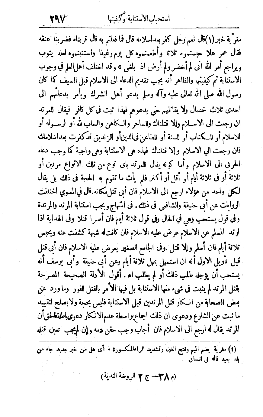 مغربة خبر1 قال نعم: رجل كفر بعد إسلامه قال: فما فعلتم به قال: قربناه فضربنا عنقه فقال عمر: هلا حبستموه ثلاثا وأطعمتموه كل يوم رغيفا واستتبتموه لعله يتوب ويراجع أمر الله إني لم أحضر ولم أرض إذا بلغني" وقد اختلف أهل العلم في وجوب الاستتابة ثم كيفيتها والظاهر أنه يجب تقديم الدعاء إلى الإسلام قبل السيف كما كان رسول الله صلى الله تعالى عليه وآله وسلم يدعو أهل الشرك ويأمر بدعائهم إلى إحدى ثلاث خصال ولا يقاتلهم حتى يدعوهم فهذا ثبت في كل كافر فيقال للمرتد إن رجعت إلى الإسلام وإلا قتلناك وللساحر والكاهن والساب لله أو لرسوله أو للإسلام أو للكتاب أو للسنة أو للطاعن في الدين أو الزنديق قد كفرت بعد إسلامك فإن رجعت إلى الإسلام وإلا قتلناك فهذه هي الاستتابة وهي واجبة كما وجب دعاء الحربي إلى الإسلام وأما كونه يقال للمرتد بأي نوع من تلك الأنواع مرتين أو ثلاثة أو في ثلاثة أيام أو أقل أو أكثر فلم يأت ما تقوم به الحجة في ذلك بل يقال لكل واحد من هؤلاء ارجع إلى الإسلام فإن أبى قتل مكانه قال في المسوى: اختلفت الروايات عن أبي حنيفة والشافعي في ذلك وفي المنهاج ويجب استتابة المرتد والمرتدة وفي قول يستحب وهي في الحال وفي قول ثلاثة أيام فإن أصرّا قتلا وفي الهداية إذا ارتد المسلم عن الإسلام عرض عليه الإسلام فإن كانت له شبهة كشفت عنه ويحبس ثلاثة أيام فإن أسلم وإلا قتل وفي الجامع الصغير يعرض عليه الإسلام فإن أبى قتل قيل تأويل الأول أنه إن استمهل يمهل ثلاثة أيام وعن أبي حنيفة وأبي يوسف أنه يستحب أن يؤجله طلب ذلك أو لم يطلب اهـ. أقول: الأدلة الصحيحة المصرحة بقتل المرتد لم يثبت في شئ منها الاستتابة بل فيها الأمر القتل للفور وما ورد عن بعض الصحابة من إنكار قتل المرتدين قبل الاستتابة فليس بحجة ولا يصلح لتقييد ما ثبت عن الشارع ودعوى أن ذلك إجماع بواسطة عدم الإنكار دعوى باطلة فالحق أن المرتد يقال له ارجع إلى الإسلام فإن أجاب وجب حقن دمه وإن لم يجب تعين قتله