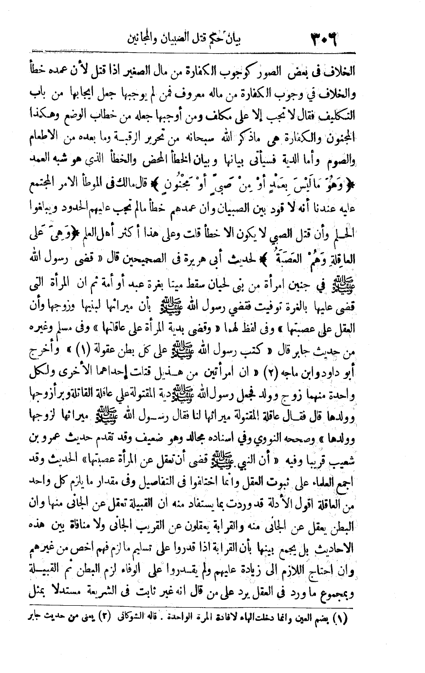 الخلاف في بعض الصور كوجوب الكفارة من مال الصغير إذا قتل لأن عمده خطأ والخلاف في وجوب الكفارة من ماله معروف فمن لم يوجبها جعل إيجابها من باب التكليف فقال: لا تجب إلا على مكلف ومن أوجبها جعله من خطاب الوضع وهكذا المجنون والكفارة هي ما ذكر الله سبحانه من تحرير الرقبة وما بعده من الإطعام والصوم وأما الدية فسيأتي بيانها وبيان الخطإ المحض والخطإ الذي هو شبه العمد "وهو ما ليس بعمد أو من صبي أو مجنون" قال مالك في الموطإ: الأمر المجتمع عليه عندنا أنه لا قود بين الصبيان وأن عمدهم خطأ ما لم تجب عليهم الحدود ويبلغوا الحلم وأن قتل الصبي لا يكون إلا خطأ قلت: وعلى هذا أكثر أهل العلم "وهي على العاقلة وهم العصبة" لحديث أبي هريرة في الصحيحين قال: "قضى رسول الله صلى الله عليه وسلم في جنين امرأة من بني لحيان سقط ميتا بغرة عبد أو أمة ثم إن المرأة التي قضى عليها بالغرة توفيت فقضى رسول الله صلى الله عليه وسلم بأن ميراثها لبنيها وزوجها وأن العقل على عصبتها" وفي لفظ لهما "وقضى بدية المرأة على عاقلتها" وفي مسلم وغيره من حديث جابر قال: "كتب رسول الله صلى الله عليه وسلم على كل بطن عقولة1" وأخرج أبو داود وابن ماجه2 "أن امرأتين من هذيل قتلت إحداهما الآخرى ولك واحدة منها زوج وولد فجعل رسول الله صلى الله عليه وسلم دية المقتولة على عاقلة القاتلة وبرأ زوجها وولدها قال: فقال عاقلة المقتولة ميراثها لنا فقال: رسول الله صلى الله عليه وسلم:" ميراثها لزوجها وولدها" وصححه النووي وفي إسناده مجالد وهو ضعيف وقد تقدم حديث عمرو بن شعيب قريبا وفيه "أن النبي صلى الله عليه وسلم قضى أن تعقل عن المرأة عصبتها" الحديث وقد أجمع العلماء على ثبوت العقل وإنما اختلفوا في التفاصيل وفي مقدار ما يلزم كل واحد من العاقلة أقول: الأدلة قد وردت بما يستفاد منه أن القبيلة تعقل عن الجاني منها وأن البطن يعقل عن الجاني منه والقرابة يعقلون عن القريب الجاني ولا منافاة بين هذه الأحاديث بل يجمع بينها بأن القرابة إذا قدروا على تسليم ما لزم فهم أخص من غيرهم وإن احتاج اللازم إلى زيادة عليهم ولم يقدروا على الوفاء لزم البطن ثم القبيلة وبمجموع ما ورد في العقل يرد على من قال إنه غير ثابت في الشريعة مستدلا بمثل