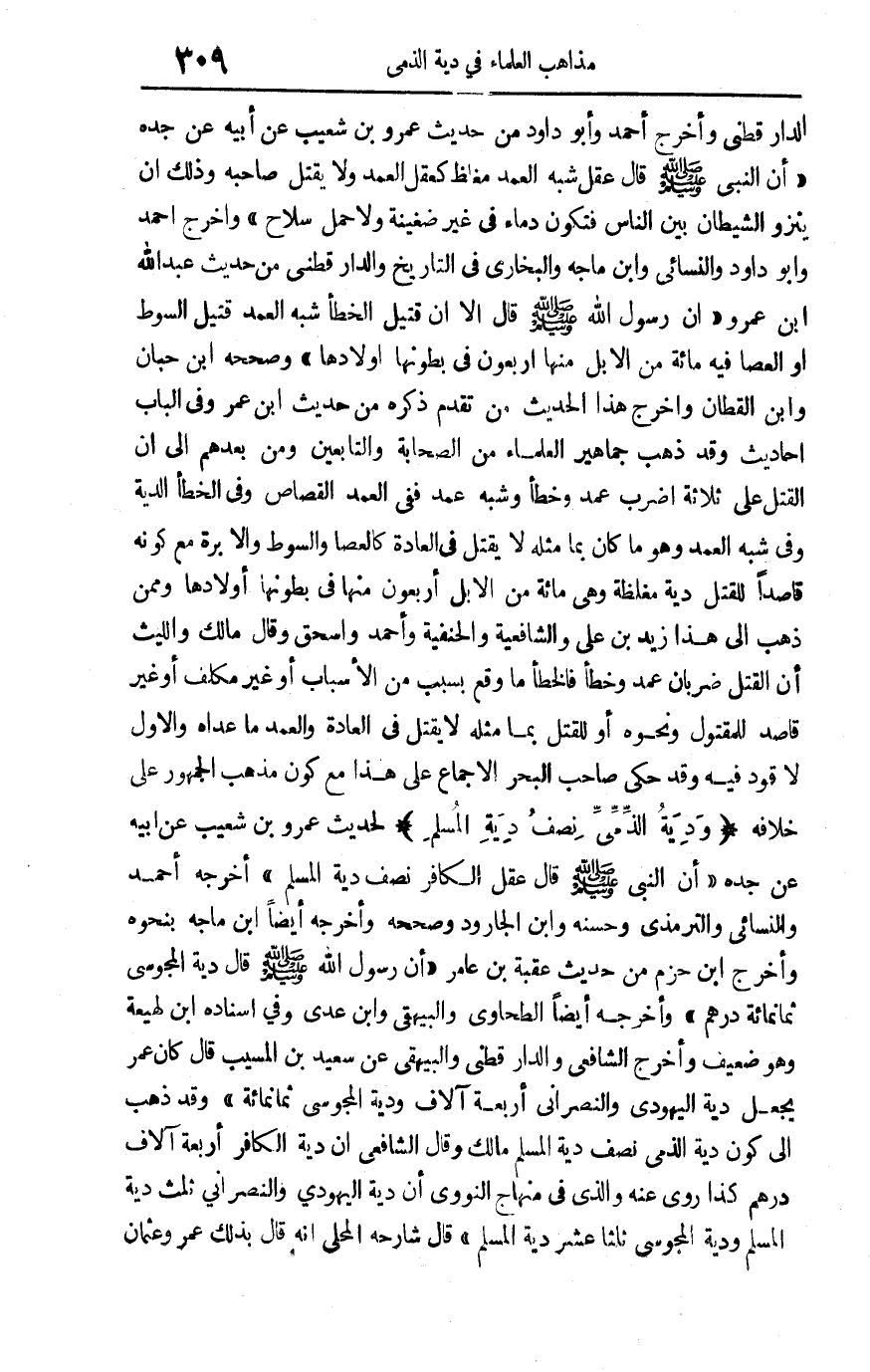 الدارقطني وأخرج أحمد وأبو داود من حديث عمرو بن شعيب عن أبيه عن جده أن النبي صلى الله عليه وسلم قال: "عقل شبه العمد مغلظ كعقل العمد ولا يقتل صاحبه وذلك أن ينزو الشيطان بين الناس فتكون دماء في غير ضغينة ولا حمل سلاح" وأخرج أحمد وأبو داود والنسائي وابن ماجه والبخاري في التاريخ والدارقطني من حديث عبد الله بن عمرو أن رسول الله صلى الله عليه وسلم قال: "ألا إن قتيل الخطأ شبه العمد قتيل السوط أو العصا فيه مائة من الإبل منها أربعون في بطونها أولادها" وصححه ابن حبان وابن القطان وأخرج هذا الحديث من تقدم ذكره من حديث ابن عمر وفي الباب أحاديث وقد ذهب جماهير العلماء من الصحابة والتابعين ومن بعدهم إلى أن القتل على ثلاثة أضرب: عمد خطأ وشبه عمد ففي العمد القصاص وفي الخطأ الدية وفي شبه العمد وهو ما كان بما مثله لا يقتل في العادة كالعصا والسوط والإبرة مع كونه قاصدا للقتل دية مغلظة وهي مائة من الإبل أربعون منها في بطونها أولادها وممن ذهب إلى هذا زيد بن علي والشافعية والحنفية وأحمد وإسحق وقال مالك والليث: إن القتل ضربان: عمد وخطأ فالخطأ ما وقع بسبب من الأسباب أو غير مكلف أو غير قاصد للمقتول ونحوه أو للقتل بما مثله لا يقتل في العادة والعمد ما عداه والأول لا قود فيه وقد حكى صاحب البحر الإجماع على هذا مع كون مذهب الجمهور على خلافه "ودية الذمي نصف دية المسلم" لحديث عمرو بن شعيب عن أبيه عن جده أن النبي صلى الله عليه وسلم قال: "عقل الكافر نصف دية المسلم" أخرجه أحمد والنسائي والترمذي وحسنه وابن الجارود وصححه وأخرجه أيضا ابن ماجه بنحوه وأخرج ابن حزم من حديث عقبة بن عامر أن رسول الله صلى الله عليه وسلم قال: "دية المجوسي ثمانمائة درهم" وأخرجه أيضا الطحاوي والبيهقي وابن عدي وفي إسناده ابن لهيعة وهو ضعيف وأخرج الشافعي والدارقطني والبيهقي عن سعيد بن المسبب قال: كان عمر يجعل دية اليهودي والنصراني أربعة آلاف ودية المجوسي ثمانمائة "وقد ذهب إلى كون دية الذمي نصف دية المسلم مالك وقال الشافعي: إن دية الكافر أربعة آلاف درهم كذا روي عنه والذي في منهاج النووي أن دية اليهودي والنصراني ثلث دية المسلم ودية المجوسي ثلثا عشر دية المسلم" قال شارحه المحلي: إنه قال بذلك عمر وعثمان