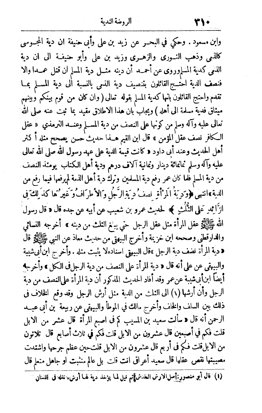 وابن مسعود وحكى في البحر عن زيد بن علي وأبي حنيفة أن دية المجوسي كالذمي وذهب الثوري والزهري وزيد بن علي وأبو حنيفة إلى أن دية الذمي كذية المسلم وروي عن أحمد أن ديته مثل دية المسلم إن قتل عمدا وإلا فنصف الدية احتج القائلون بتنصيف دية الذمي بالنسبة إلى دية المسلم بما تقدم واحتج القائلون بأنها كدية المسلم بقوله تعالى: {وَإِنْ كَانَ مِنْ قَوْمٍ بَيْنَكُمْ وَبَيْنَهُمْ مِيثَاقٌ فَدِيَةٌ مُسَلَّمَةٌ إِلَى أَهْلِهِ} ويجاب بأن هذا الإطلاق مقيد بما ثبت عنه صلى الله تعالى عليه وآله وسلم من كونها على النصف من دية المسلم وعند الترمذي "عقل الكافر نصف عقل المؤمن" "قال ابن القيم: هذا حديث حسن يصحح مثله أكثر أهل الحديث وعند أبي داود "كانت قيمة الدية على عهد رسول الله صلى الله عليه وآله وسلم ثمانمائة دينار وثمانية آلاف درهم ودية أهل الكتاب يومئذ النصف من دية المسلم فلما كان عمر رفع دية المسلمين وترك دية أهل الذمة لم يرفعها فيما من الدية" انتهى "ودية المرأة نصف دية الرجل والأطراف وغيرها كذلك في الزائد على الثلث" لحديث عمرو بن شعيب عن أبيه عن جده قال: قال رسول الله صلى الله عليه وسلم: "عقل المرأة مثل عقل الرجل حتى يبلغ الثلث من ديته" أخرجه النسائي والدارقطني وصححه ابن خزيمة وأخرج البيهقي من حديث معاذ عن النبي صلى الله عليه وسلم قال: "دية المرأة نصف دية الرجل" قال البيهقي: إسناده لا يثبت مثله وأخرج ابن أبي شيبة والبيهقي عن علي أنه قال: "دية المرأة على النصف من دية الرجل في الكل" وأخرجه أيضا ابن أبي شيبة عن عمر وقد أفاد الحديث المذكور أن دية المرأة على النصف من دية الرجل وأن أرشها1 إلى الثلث من الدية مثل أرش الرجل وقد وقع الخلاف في ذلك بين السلف والخلف وأخرج مالك في الموطأ والبيهقي عن ربيعة بن عبد الرحمن أنه قال: سألت سعيد بن المسيب كم في أصبع المرأة قال: عشر من الإبل قلت: فكم في إصبعين قال: عشرون من الإبل قلت: فكم في ثلاث أصابع قال: ثلاثون من الإبل قلت: فكم في أربع قال: عشرون من الإبل قلت: حين عظم جرحها واشتدت مصيبتها نقص عقلها قال سعيد: أعراقي أنت؟ قلت: بل عالم متثبت أو جاهل متعلم قال: