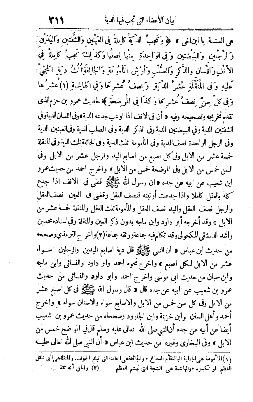 هي السنة يا ابن أخي. "وتجب الدية كاملة في العينين والشفتين واليدين والرجلين والبيضتين وفي الواحدة منها نصفها وكذلك تجب كاملة في الأنف واللسان والذكر والصلب وأرش المأمومة والجائفة ثلث دية المجني عليه وفي المنقلة عشر الدية ونصف الدية ونصف عشرها وفي الهاشمة1 عشرها وفي كل سن نصف عشرها وكذا في الموضحة" لحديث عمرو بن حزم الذي تقدم تخريجه وتصحيحه وفيه "أن في الأنف إذا أوعب جدعة الدية وفي اللسان الدية وفي الشفتين الدية وفي البيضتين الدية وفي الذكر الدية وفي الصلب الدية وفي العينين الدية وفي الرِّجل الواحدة نصف الدية وفي المأمومة ثلث الدية وفي الجائفة ثلث الدية وفي المنقلة خمسة عشر من الإبل وفي كل إصبع من أصابع اليد والرجل عشر من الإبل وفي السن خمس من الإبل وفي الموضحة خمس من الإبل "وأخرج أحمد من حديث عمرو بن شعيب عن أبيه عن جده"أن رسول الله صلى الله عليه وسلم قضى في الأنف إذا جدع كله بالعقل كاملا وإذا جدعت أرنبته فنصف العقل وقضى في العين نصف العقل والرّجل نصف العقل واليد نصف العقل والمأمومة ثلث العقل والمنقلة خمسة عشر من الإبل" وقد أخرجه أبو داود وابن ماجه بدون ذكر العين والمنقلة وفي إسناده محمد بن راشد الدمشقي المكحولي وقد تكلم فيه جماعة ووثقه جماعة2 وأخرج الترمذي وصححه من حديث ابن عباس أن النبي صلى الله عليه وسلم قال: "دية أصابع اليدين والرجلين سواء عشر من الإبل لكل أصبع" وأخرج نحوه أحمد وأبو داود والنسائي وابن ماجه وابن حبان من حديث أبي موسى وأخرج أحمد وأبو داود والنسائي من حديث عمرو بن شعيب عن أبيه عن جده قال: قال رسول الله صلى الله عليه وسلم: "في كل أصبع عشر من الإبل وفي كل سن خمس من الإبل والأصابع سواء والأسنان سواء" وأخرج أحمد وأهل السنن وابن خزيمة وابن الجارود وصححاه من حديث عمرو بن شعيب أيضا عن أبيه عن جده أن النبي صلى الله تعالى عليه وسلم قال: "في المواضح خمس من الإبل" وفي البخاري وغيره من حديث ابن عباس "أن النبي صلى الله تعالى عليه