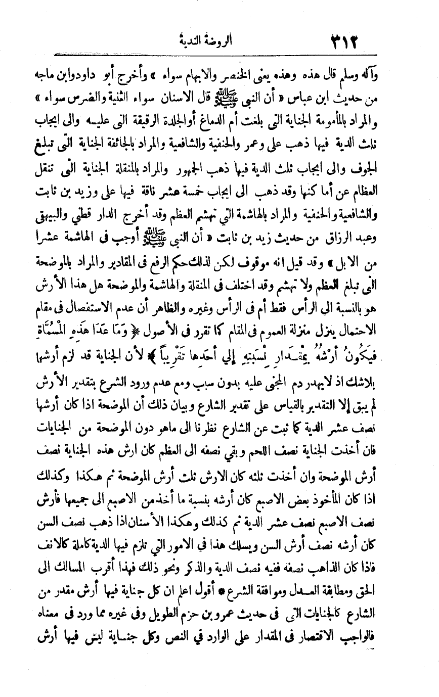 وآله وسلم قال: "هذه وهذه يعني الخنصر والإبهام سواء" وأخرج أبو داود وابن ماجه من حديث ابن عباس أن النبي صلى الله عليه وسلم قال: "الأسنان سواء الثنية والضرس سواء" والمراد بالمأمومة الجناية التي بلغت أم الدماغ أو الجلدة الرقيقة التي عليه وإلى إيجاب ثلث الدية فيها ذهب علي وعمر والحنفية والشافعية والمراد بالجائفة الجناية التي تبلغ الجوف وإلى إيجاب ثلث الدية فيها ذهب الجمهور والمراد بالمنقلة الجناية التي تنقل العظام عن أماكنها وقد ذهب إلى إيجاب خمسة عشر ناقة فيها علي وزيد بن ثابت والشافعية والحنفية والمراد بالهاشمة التي تهشم العظم وقد أخرج الدارقطني والبيهقي وعبد الرزاق من حديث زيد بن ثابت "أن النبي صلى الله عليه وسلم أوجب في الهاشمة عشرا من الإبل" وقد قيل: إنه موقوف لكن لذلك حكم الرفع في المقادير والمراد بالموضحة التي تبلغ العظم ولا تهشم وقد اختلف في المنقلة والهاشمة والموضحة هل هذا الأرش هو بالنسبة إلى الرأس فقط أم الرأس وغيره والظاهر أن عدم الاستفصال في مقام الاحتمال ينزل منزلة العموم في المقام كما تقرر في الأصول" وما عدا هذه المسماة فيكون أرشه بمقدار نسبته إلى أحدها تقريبا لأن الجناية قد لزم أرشها بلا شك إذ لا يهدر دم المجني عليه بدون سبب ومع عدم ورود الشرع بتقدير الأرش لم يبق إلا التقدير بالقياس على تقدير الشارع وبيان ذلك أن الموضحة إذا كان أرشها نصف عشر الدية كما ثبت عن الشارع نظرنا إلى ما هو دون الموضحة من الجنايات فإن أخذت الجناية نصف اللحم وبقي نصفه إلى العظم كان أرش هذه الجناية نصف أرش الموضحة وإن أخذت ثلثه كان الأرش ثلث أرش الموضحة ثم هكذا وكذلك إذا كان المأخوذ بعض الأصبع كان أرشه بنسبة ما أخذ من الأصبع إلى جميعها فأرش نصف الأصبع نصف عشر الدية ثم كذلك وهكذا الأسنان إذا ذهب نصف السن كان أرشه نصف أرش السن ويسلك هذا في الأمور التي تلزم فيها الدية كاملة كالأنف فإذا كان الذاهب نصفه ففيه نصف الدية والذكر ونحو ذلك فهذا أقرب المسالك إلى الحق ومطابقة العدل وموافقة الشرع.