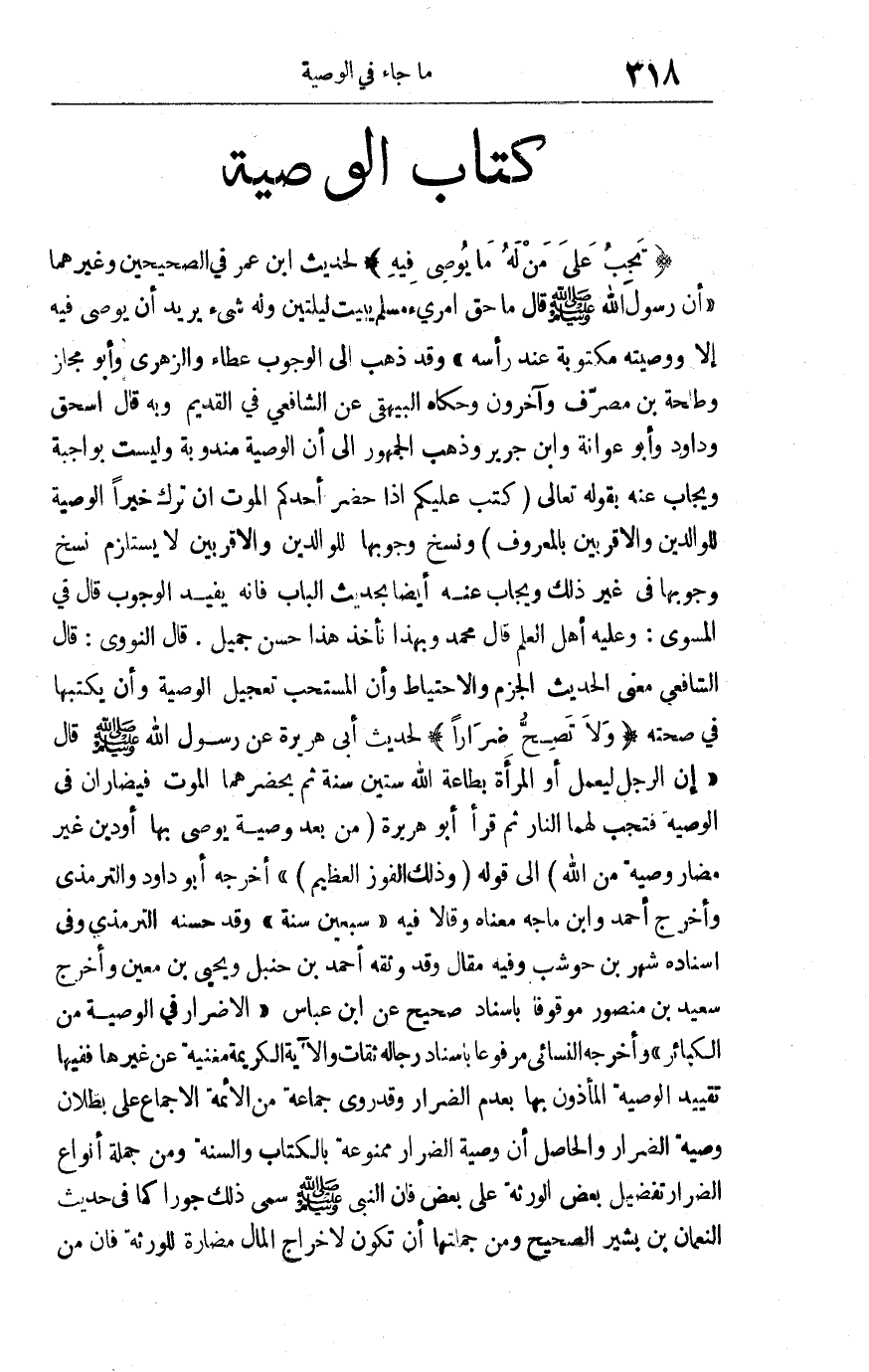 "تجب على من له ما يوصي فيه" لحديث ابن عمر في الصحيحين وغيرهما أن رسول الله صلى الله عليه وسلم قال: "ما حق امريء مسلم يبيت ليلتين وله شئ يريد أن يوشي فيه إلا ووصيته مكتوبة عند رأسه" وقد ذهب إلى الوجوب عطاء والزهري وأبو مجاز وطلحة بن مصرف وآخرون وحكاه البيهقي عن الشافعي في القديم وبه قال اسحق وداود وأبو عوانة وابن جرير وذهب الجمهور إلى أن الوصية مندوبة وليست بواجبة ويجاب عنه بقوله تعالى: {كُتِبَ عَلَيْكُمْ إِذَا حَضَرَ أَحَدَكُمُ الْمَوْتُ إِنْ تَرَكَ خَيْراً الْوَصِيَّةُ لِلْوَالِدَيْنِ وَالْأَقْرَبِينَ بِالْمَعْرُوفِ} ونسخ وجوبها للوالدين والأقربين لا يستلزم نسخ وجوبها في غير ذلك ويجاب عنه أيضا بحديث الباب فإنه يفيد الوجوب قال في المسوى: وعليه أهل العلم قال محمد: وبهذا نأخذ هذا حسن جميل قال النووي: قال الشافعي معنى الحديث الجزم والاحتياط وأن المستحب تعجيل الوصية وأن يكتبها في صحته "ولا تصح ضرار" لحديث أبي هريرة عن رسول الله صلى الله عليه وسلم قال: "إن الرجل ليعمل أو المرأة بطاعة الله ستين سنة ثم يحضرهما الموت فيضاران في الوصية فتجب لهما النار" ثم قرأ أبو هريرة {مِنْ بَعْدِ وَصِيَّةٍ يُوصَى بِهَا أَوْ دَيْنٍ غَيْرَ مُضَارٍّ وَصِيَّةً مِنَ اللَّهِ} إلى قوله: {وَذَلِكَ الْفَوْزُ الْعَظِيمُ} "أخرجه أبو داود والترمذي وأخرج أحمد وابن ماجه معناه وقالا: فيه "سبعين سنة "وقد حسنه الترمذي وفي إسناده شهر بن حوشب وفيه مقال وقد وثقه أحمد بن حنبل ويحيى بن معين وأخرج ابن منصور موقوفا بإسناد صحيح عن ابن عباس "الإضرار في الوصية من الكبائر" وأخرجه النسائي مرفوعا بإسناد رجاله ثقات والآية الكريمة مغنية عن غيرها ففيها تقييد الوصية المأذون بها بعدم الضرار وقد روى جماعة من الأئمة الإجماع على بطلان وصية الضرار والحاصل: أن وصية الضرار ممنوعة بالكتاب والسنة ومن جملة أنواع الضرار تفضيل بعض الورثة على بعض فإن النبي صلى الله عليه وسلم سمى ذلك جورا كما في حديث النعمان بن بشير الصحيح ومن جملتها أن تكون لإخراج المال مضارة للورثة فإن من