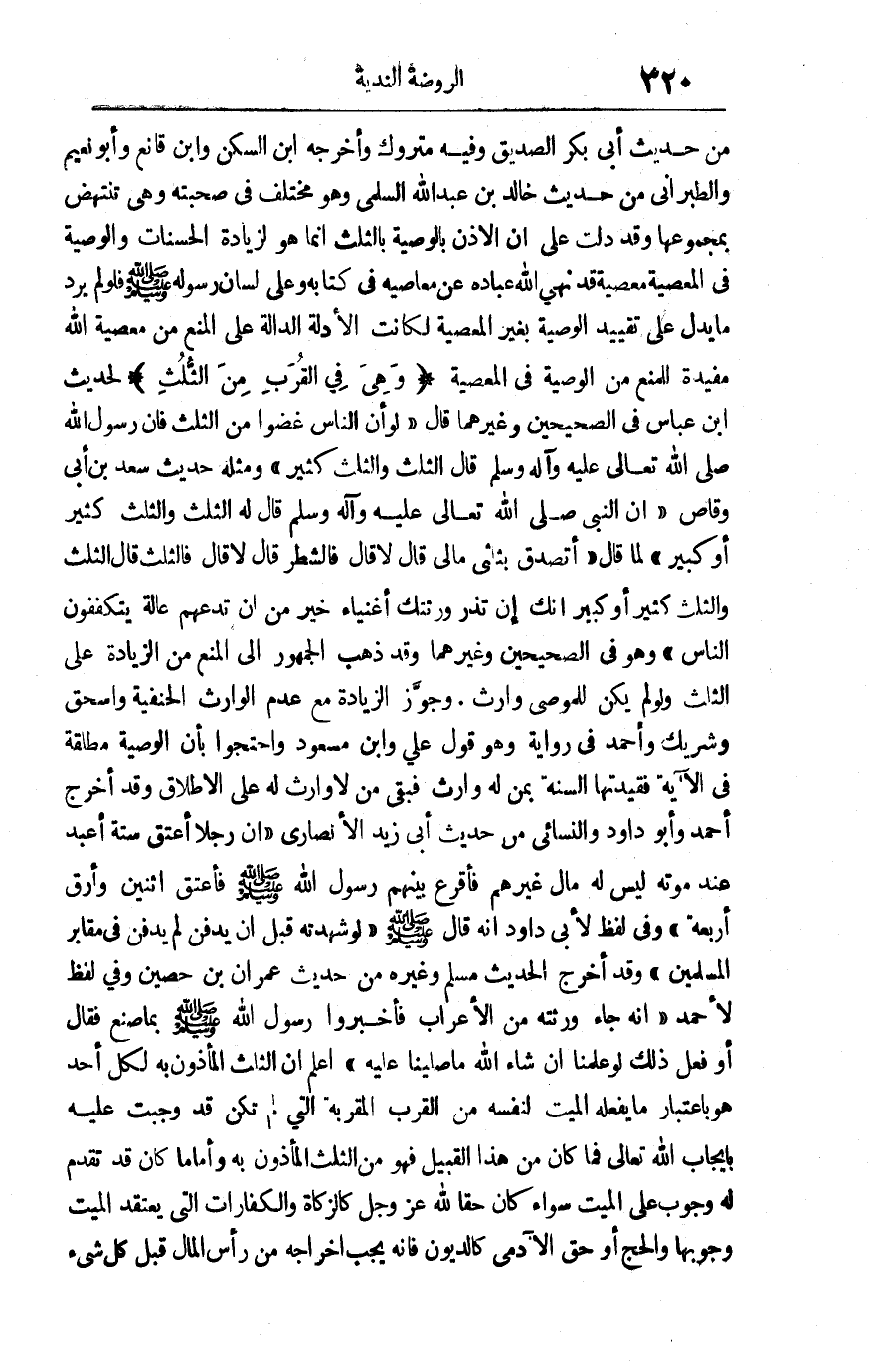 من حديث أبي بكر الصديق وفيه متروك وأخرج ابن السكن وابن قانع وأبو نعيم والطبراني من حديث خالد بن عبد الله السلمي وهو مختلف في صحبته وهي تنتهض بمجموعها وقد دلت على أن الإذن بالوصية بالثلث إنما هو لزيادة الحسنات والوصية في المعصية معصية قد نهى الله عباده عن معاصيه في كتابه وعلى لسان رسوله صلى الله عليه وسلم فلو لم يرد ما يدل على تقييد الوصية بغير المعصية لكانت الأدلة الدالة على المنع من معصية الله مفيدة للمنع من الوصية في المعصية "وهي في القرب من الثلث" لحديث ابن عباس في الصحيحين وغيرهما قال: "لو أن الناس غضوا من الثلث فإن رسول الله صلى الله تعالى عليه وآله وسلم قال: "الثلث والثلث كثير" ومثله حديث سعد بن أبي وقاص "أن النبي صلى الله تعالى عليه وآله وسلم قال له: "الثلث والثلث كثير أو كبير لما قال: أتصدق بثلثي مالي قال: لا قال: فالشطر قال: لا قال: فالثلث قال: الثلث والثلث كثير أو كبير لما قال: أتصدق بثلثي مالي قال: لا قال: فالشطر قلا: لا: فالثلث قال: الثلث والثلث كثير أو كبير إنك أن تذر ورثتك أغنياء خير من أن تدعهم عالة يتكففون الناس" وهو في الصحيحين وغيرهما وقد ذهب الجمهور إلى المنع من الزيادة على الثلث ولو لم يكن للموصي وارث وجوز الزيادة مع عدم الوارث الحنفية واسحق وشريك وأحمد في رواية وهو قول علي وابن مسعود واحتجوا بأن الوصية مطلقة في الآية فقيدتها السنة بمن له وارث فبقي من لا وارث له على الإطلاق وقد أخرج أحمد وأبو داود والنسائي من حديث أبي زيد الأنصاري "أن رجلا أعتق ستة أعبد عند موته ليس له مال غيرهم فأقرع بينهم رسول الله صلى الله عليه وسلم فأعتق اثنين وأرق أربعة" وفي لفظ لأبي داود أنه قال صلى الله عليه وسلم "لو شهدته قبل أن يدفن لم يدفن في مقابر المسلمين" وقد أخرج الحديث مسلم وغيره من حديث عمران بن حصين وفي لفظ لأحمد "أنه جاء ورثته من الأعراب فأخبروا رسول الله صلى اله عليه وسلم بما صنع فقال أو فعل ذلك! لو علمنا إن شاء الله ما صلينا عليه" اعلم أن الثلث المأذون به لكل واحد باعتبار ما يفعله الميت لنفسه من القرب المقربة التي لم تكن قد وجبت عليه بإيجاب الله تعالى فما كان من هذا القبيل فهو من الثلث المأذون به وأما ما كان قد تقدم له وجوب على الميت سواء كان حقا لله عز وجل كالزكارة والكفارات التي يعتقد الميت وجوبها والحج أو حق الآدمي كالديون فإنه يجب إخراجه من رأس المال قبل كل شئ