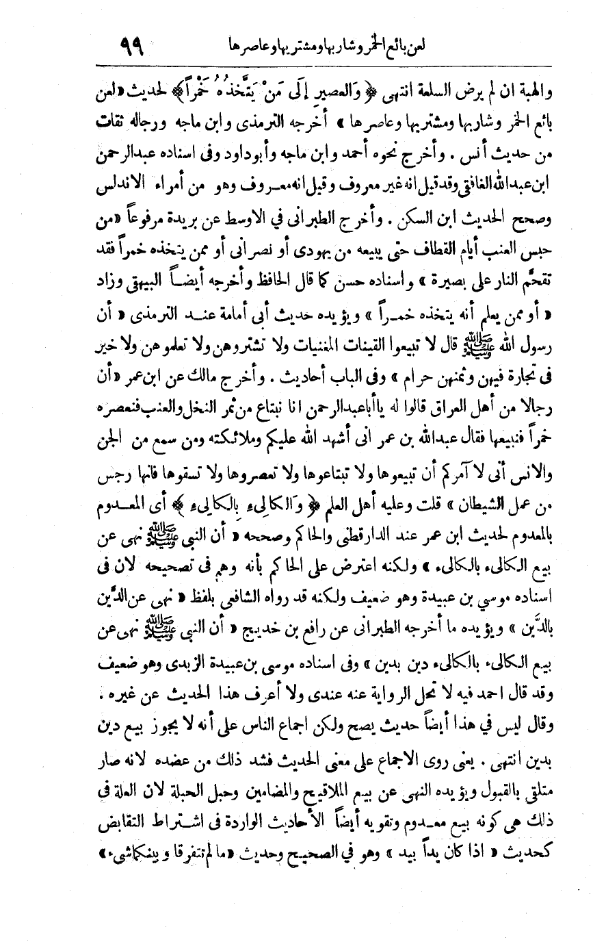 والهبة إن لم يرض السلعة انتهى "والعصير إلى من يتخذه خمرا"لحديث " لُعن بائع الخمر وشاربها ومشتريها وعاصرها" أخرجه الترمذي وابن ماجه ورجاله ثقات من حديث أنس وأخرج نحوه أحمد وابن ماجه وأبو داود وفي إسناده عبد الرحمن بن عبد الله الغافقي وقد قيل إنه غير معروف وقيل إنه معروف وهو من أمراء الأندلس وصحح الحديث ابن السكن وأخرج الطبراني في الأوسط عن بريدة مرفوعا "من حبس العنب أيام القطاف حتى يبيعه من يهودي أو نصراني أو ممن يتخذه خمرا فقد تقحم النار على بصيرة" وإسناده حسن كما قال الحافظ وأخرجه أيضا البيهقي وزاد "أو ممن يعلم أنه يتخذه خمرا" ويؤيده حديث أبي أمامة عند الترمذي "أن رسول الله صلى الله عليه وسلم قال: "لا تبيعوا القينات المغنيات ولا تشتروهن ولا تعلموهن ولا خير في تجارة فيهن وثمنهن حرام" وفي الباب أحاديث وأخرج مالك عن ابن عمر "أن رجالا من أهل العراق قالوا له يا أبا عبد الرحمن: إنا نبتاع من ثمر النخل والعنب فنعصره خمرا فنبيعها فقال عبد الله بن عمر: إني أشهد الله عليكم وملائكته ومن سمع من الجن والأنس أني لا آمر كم أن تبيعوها ولا تبتاعوها ولا تعصروها ولا تسقوها فإنها رجس من عمل الشيطان" قلت: وعليه أهل العلم "والكاليء بالكاليء" أي المعدوم بالمعدوم لحديث ابن عمر عند الدارقطني والحاكم وصححه "أن النبي صلى الله عليه وسلم نهى عن بيع الكاليء بالكاليء" ولكنه اعترض على الحاكم بأنه وهم في صحيحه لأن في إسناده موسى بن عبيدة وهو ضعيف ولكنه قد رواه الشافعي بلفظ "نهى عن الدَّين بالدَّين" ويؤيده ما أخرجه الطبراني عن رافع بن خديج "أن النبي صلى الله عليه وسلم نهى عن بيع الكاليء بالكاليء دين بدين" وفي إسناده موسى بن عبيدة الزبدي وهو ضعيف وقد قال أحمد فيه لا تحل الرواية عنه عندي ولا أعرف هذا الحديث عن غيره وقال ليس في هذا أيضا حديث يصح ولكن إجماع الناس على أنه لا يجوز بيع دين بدين انتهى يعني روي الإجماع على معنى الحديث فشد ذلك من عضده لأنه صار متلقى بالقبول ويؤيده النهي عن بيع الملاقيح والمضامين وحبل الحبلة لأن العلة في ذلك هي كونه بيع معدوم وتقويه أيضا الأحاديث الواردة في اشتراط التقابض كحديث "إذا كان يدا بيد "وهو في الصحيح وحديث "ما لم تتفرقا وبينكما شئ "