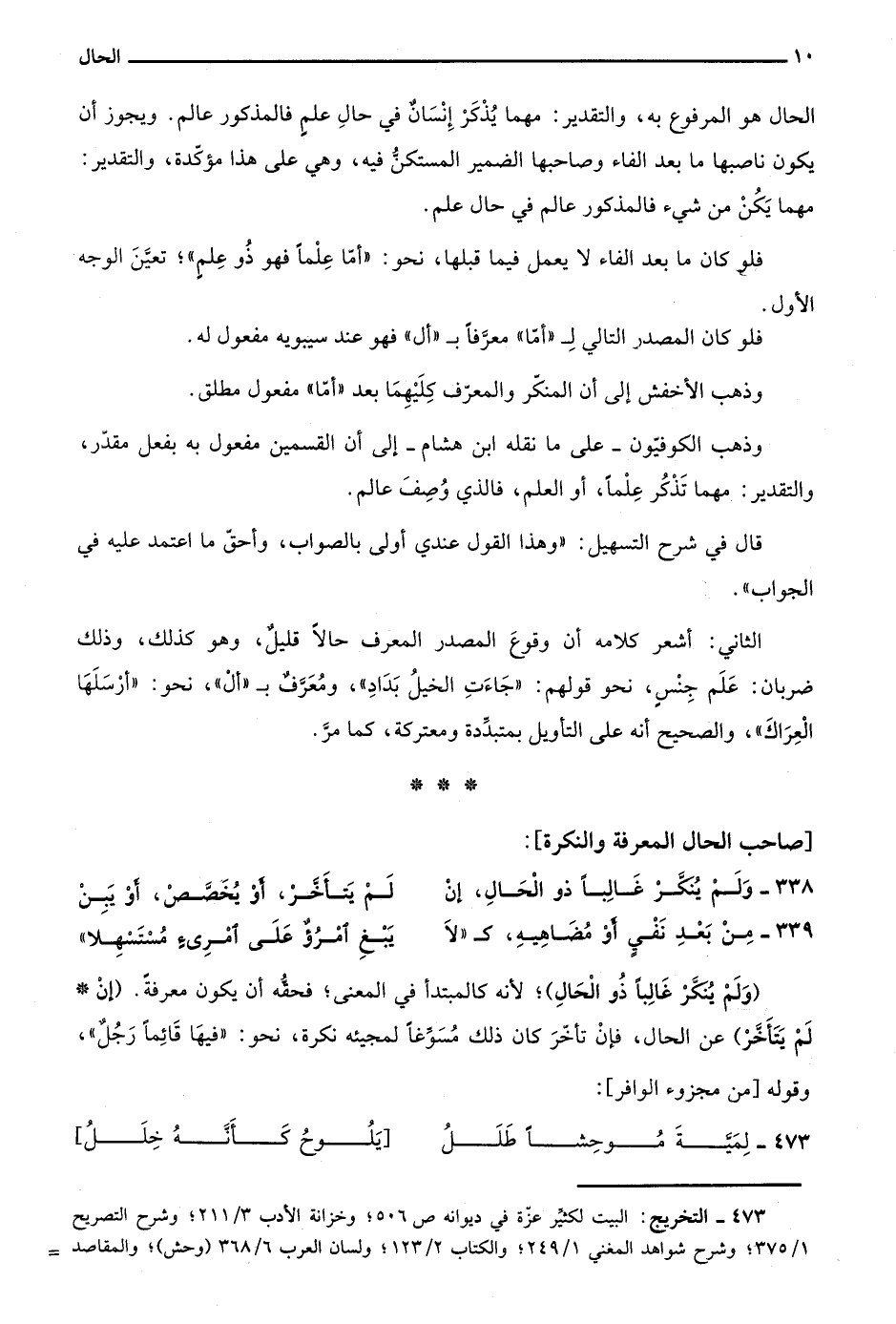 "ولم ينكر غالبا ذو الحال"؛ لأنه كالمبتدأ في المعنى؛ فحقه أن يكون معرفة. "إن لم يتأخر" عن الحال، فإن تأخر كان ذلك مسوغا لمجيئه نكرة، نحو: "فيها قائما رجل"، وقوله "من مجزوء الوافر":