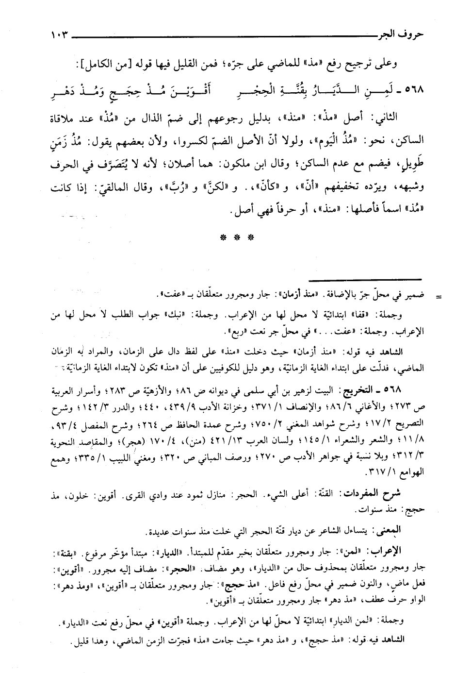 الشاهد فيه قوله: "مذ حجج"، و"مذ دهر" حيث جاءت "مذ" فجرت الزمن الماضي، وهذا قليل.