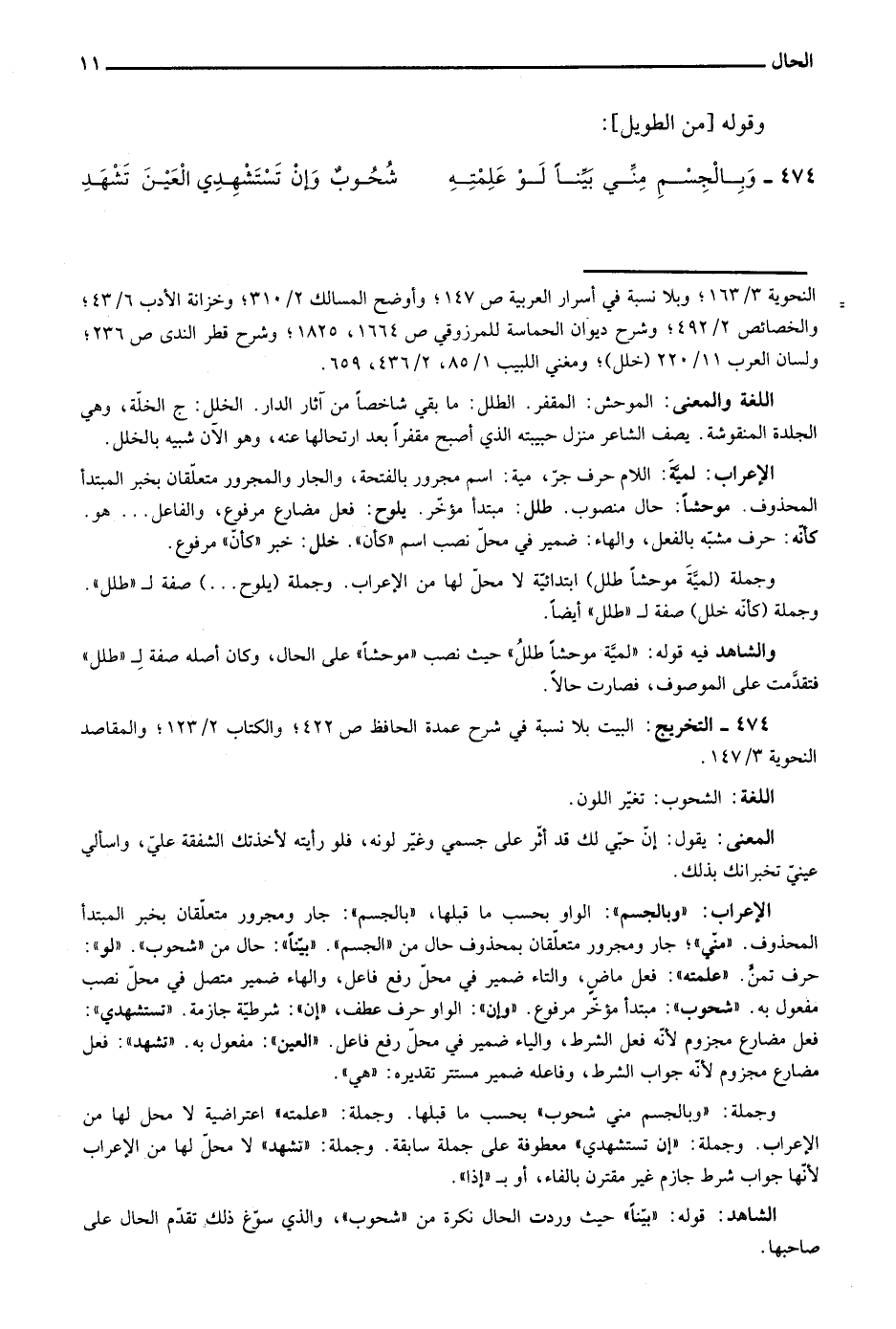 الشاهد: قوله: "بينا" حيث وردت الحال نكرة من "شحوب"، والذي سوغ ذلك تقدم الحال على صاحبها.