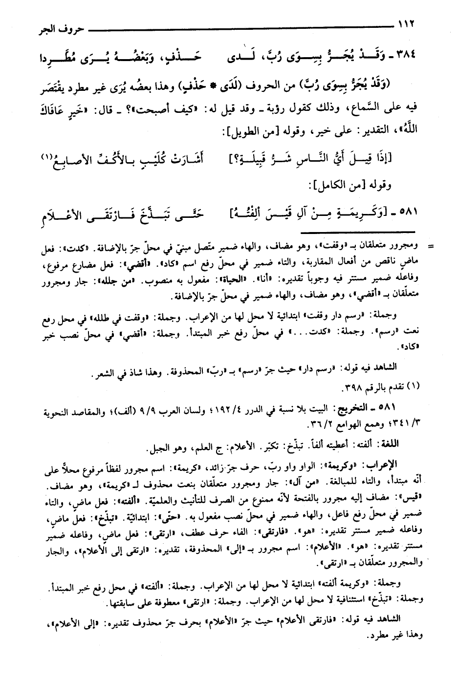 الإعراب: "وكريمة": الواو واو رب، وحرف جر زائد، "كريمة": اسم مجرور لفظًا مرفوع محلًّا على أنه مبتدأ، والتاء للمبالغة. "من آل": جار ومجرور متعلقان بنعت محذوف لـ"كريمة"، وهو مضاف "قيس": مضاف إليه مجرور بالفتحة لأنه ممنوع من الصرف للتأنيث والعلمية. "ألفته": فعل ماضٍ، والتاء ضمير في محل رفع فاعل، والهاء ضمير في محل نصب مفعول به. "حتى": ابتدائية. "تبذخ": فعل ماضٍ، وفاعله ضمير مستتر تقديره: "هو". "فارتقى": الفاء حرف عطف، "ارتقى": فعل ماضٍ، وفاعله ضمير مستتر تقديره: "هو". "الأعلام": اسم مجرور بـ"إلى" المحذوفة، تقديره: "ارتقى إلى الأعلام"، والجار والمجرور متعلقان بـ"ارتقى".
