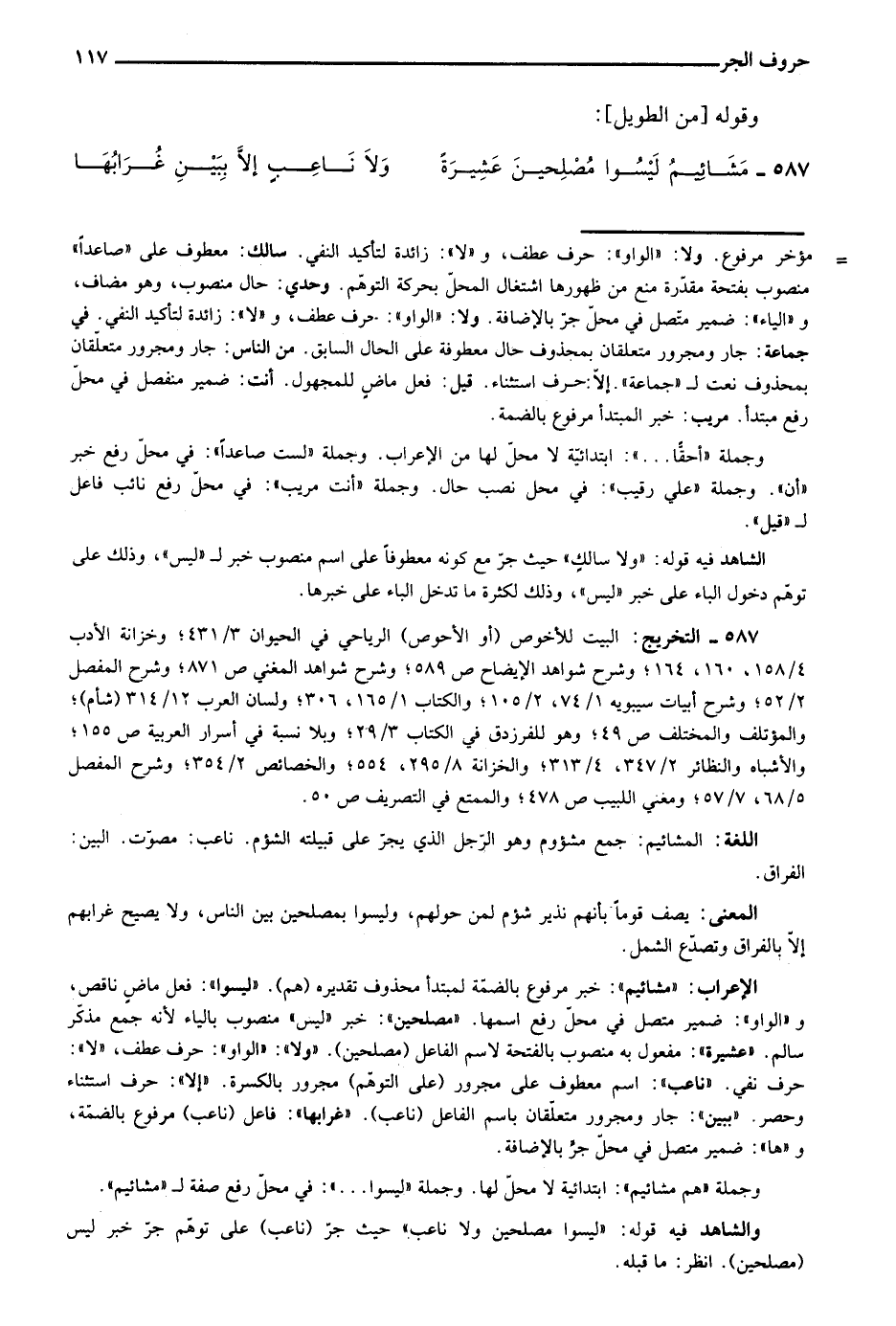 الإعراب: "مشائيم" خبر مرفوع بالضمة لمبتدأ محذوف تقديره "هم". "ليسوا": فعل ماض ناقص، و"الواو": ضمير متصل في محل رفع اسمها. "مصلحين": خبر "ليس" منصوب بالياء لأنه جمع مذكر سالم. "عشيرة": مفعول به منصوب بالفتحة لاسم الفاعل "مصلحين". "ولا": "الواو": حرف عطف، "لا": حرف نفي "ناعب": اسم معطوف على مجرور "على التوهم" مجرور بالكسرة "إلا": حرف استثناء وحصر. "ببين": جار ومجرور متعلقان باسم الفاعل "ناعب" "غرابها": فاعل "ناعب" مرفوع بالضمة، و"ها": ضمير متصل في محل جر بالإضافة.