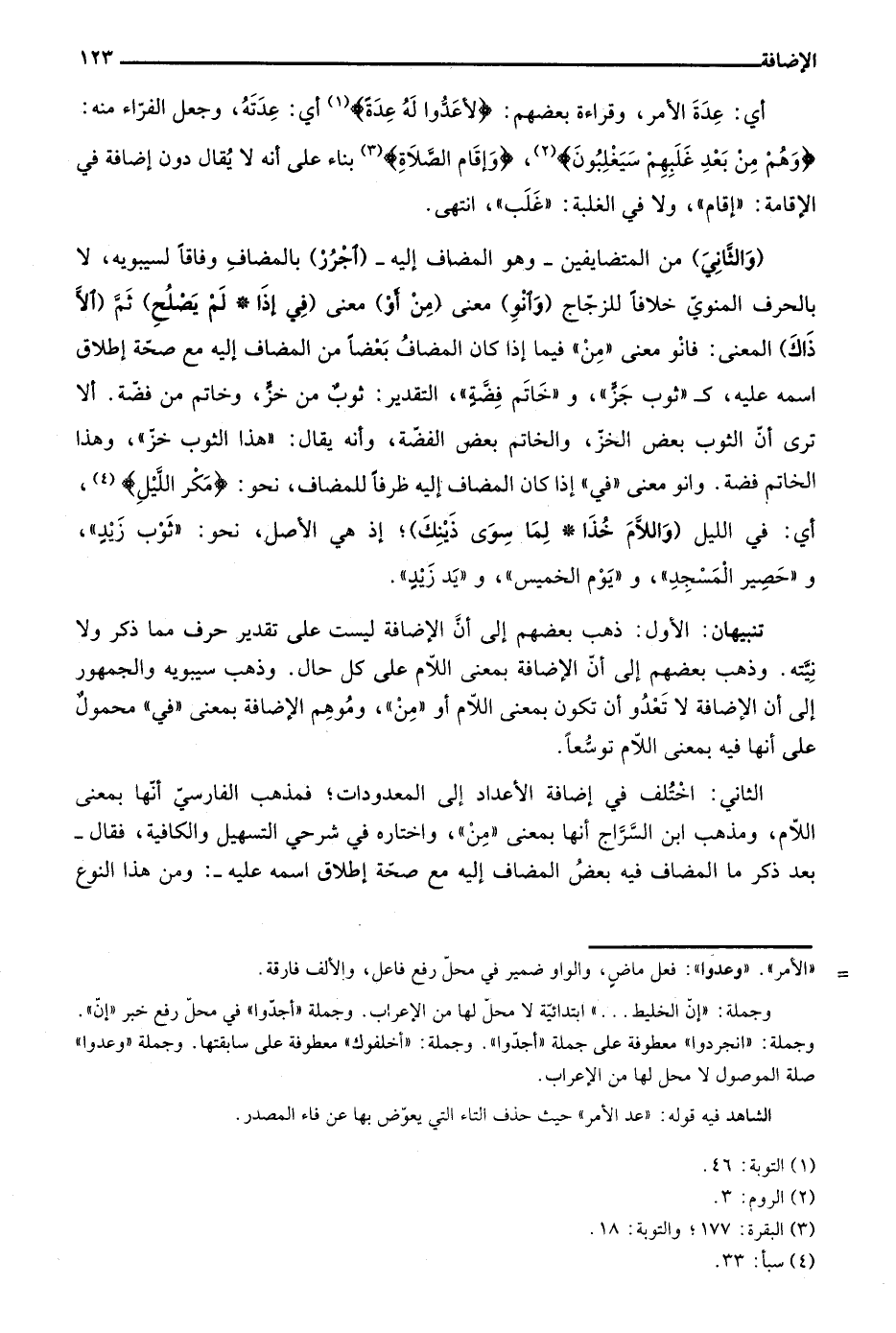 تنبيهان: الأول: ذهب بعضهم إلى أن الإضافة ليست على تقدير حرف مما ذكر ولا نيته. وذهب بعضهم إلى أن الإضافة بمعنى اللام على كل حال. وذهب سيبويه والجمهور إلى أن الإضافة لا تغدو أن تكون بمعنى اللام أو "من"، وموهم الإضافة بمعنى "في" محمول على أنها فيه بمعنى اللام توسعًا.