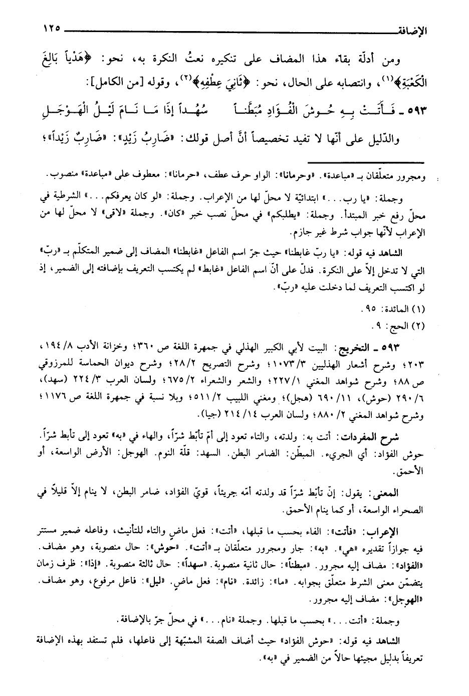 ومن أدلة بقاء هذا المضاف على تنكيره نعت النكرة به، نحو: {هَدْيًا بَالِغَ الْكَعْبَةِ} 1، وانتصابه على الحال، نحو: {ثَانِيَ عِطْفِه} 2، وقوله: "من الكامل":