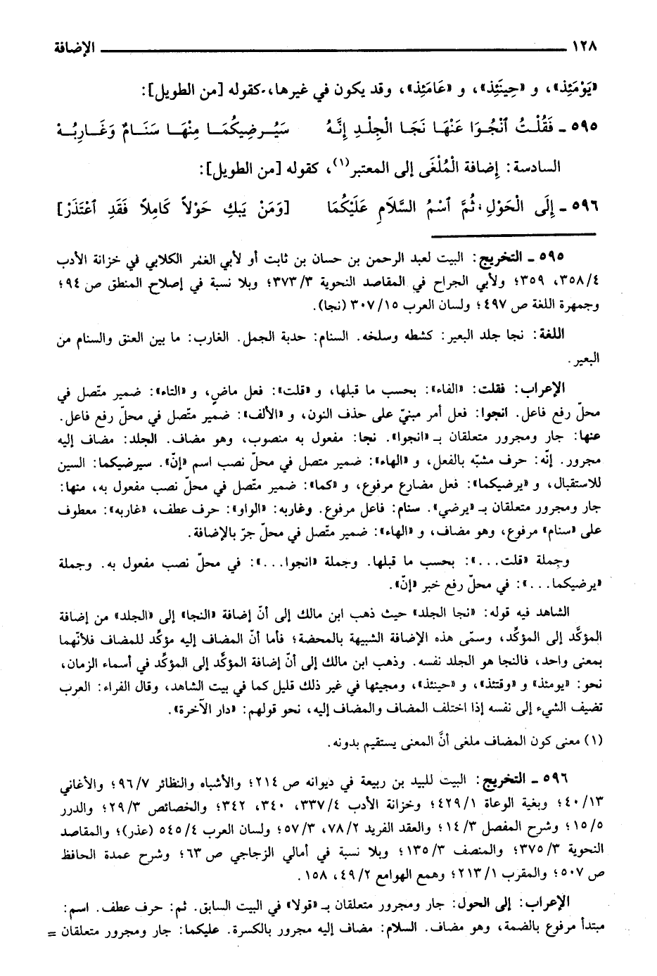 الشاهد فيه قوله: "نجا الجلد" حيث ذهب ابن مالك إلى أن إضافة "النجا" إلى "الجلد" من إضافة المؤكَّد إلى المؤكِّد، وسمى هذه الإضافة الشبيهة بالمحضة؛ فأما أن المضاف إليه مؤكد للمضاف فلأنهما بمعنى واحد، فالنجا هو الجلد نفسه، وذهب ابن مالك إلى أن إضافة المؤكَّد إلى المؤكِّد في أسماء الزمان، نحو: "يومئذ" و"وقتئذ"، و"حينئذ"، ومجيئها في غير ذلك قليل كما في بيت الشاهد، وقال الفراء: العرب تضيف الشيء إلى نفسه إذا اختلف المضاف والمضاف إليه، نحو قولهم: "دار الآخرة".
