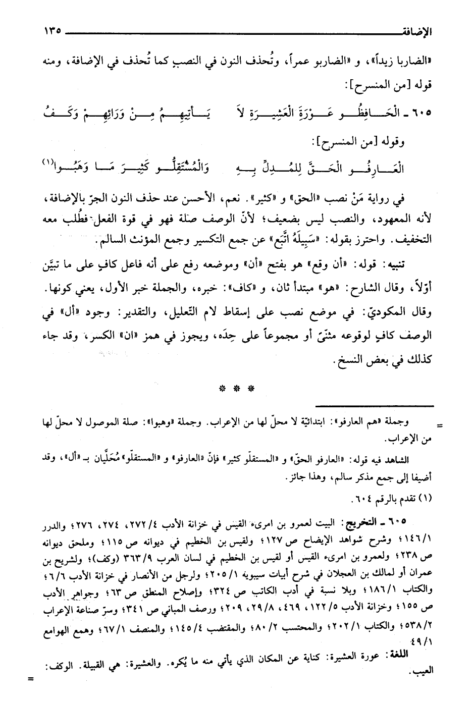 605- التخريج: البيت لعمرو بن امرئ القيس في خزانة الأدب 4/ 272، 274، 276؛ والدرر 1/ 146؛ وشرح شواهد الإيضاح ص127؛ ولقيس بن الخطيم في ديوانه ص115؛ وملحق ديوانه ص238؛ ولعمرو بن امرئ القيس أو لقيس بن الخطيم في لسان العرب 9/ 363 "وكف"؛ ولشريح بن عمران أو لمالك بن العجلان في شرح أبيات سيبويه 1/ 205؛ ولرجل من الأنصار في خزانة الأدب 6/ 6؛ والكتاب 1/ 186؛ وبلا نسبة في أدب الكاتب ص324؛ وإصلاح المنطق ص63؛ وجواهر الأدب ص155؛ وخزانة الأدب 5/ 122، 469، 8/ 29، 209؛ ورصف المباني ص341؛ وسر صناعة الإعراب 2/ 538؛ والكتاب 1/ 202؛ والمحتسب 2/ 80؛ والمقتضب 4/ 145؛ والمنصف 1/ 67؛ وهمع الهوامع 1/ 49.