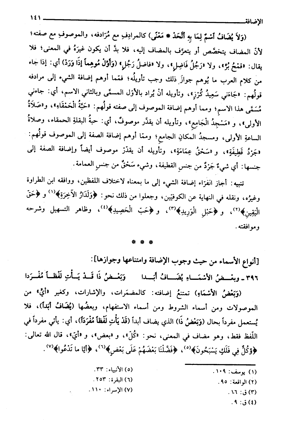 "وبعض الأسماء" تمتنع إضافته: كالمضمرات، والإشارات، وكغير "أي" من الموصولات ومن أسماء الشروط ومن أسماء الاستفهام، وبعضها "يضاف أبدًا "، فلا يستعمل مفردًا بحال "وبعض ذا" الذي يضاف أبدًا "قد يأت لفظًا مفردًا"، أي: يأتي مفردا في اللفظ فقط، وهو مضاف في المعنى، نحو: "كل"، و"بعض"، و"أي"، قال الله تعالى: {وَكُلٌّ فِي فَلَكٍ يَسْبَحُون} 5، {فَضَّلْنَا بَعْضَهُمْ عَلَى بَعْض} 6، {أَيًّا مَا تَدْعُوا} 7.