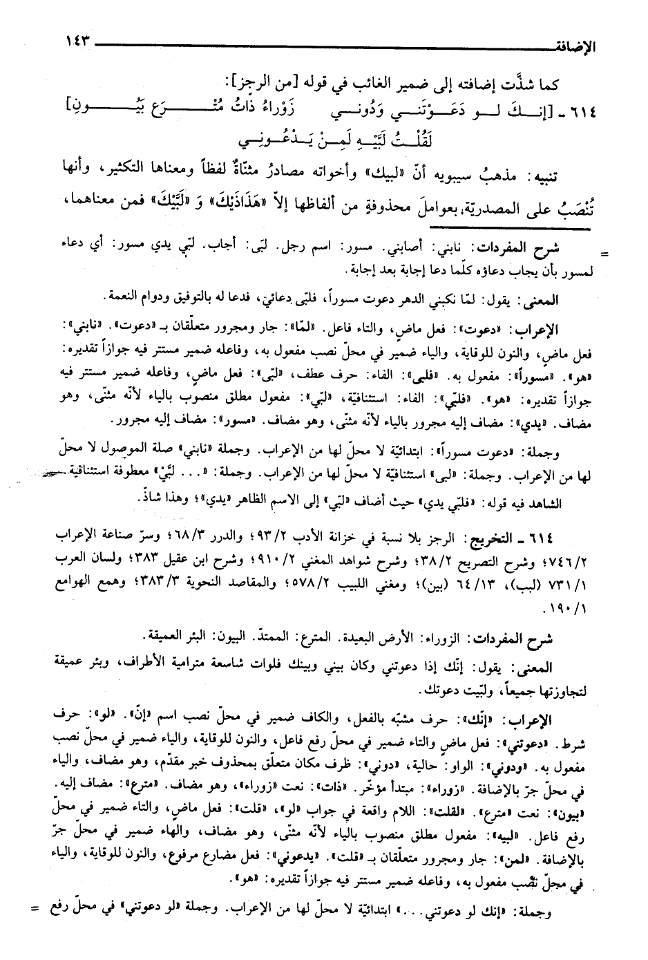 الإعراب: "دعوت": فعل ماضٍ، والتاء فاعل. "لما": جار ومجرور متعلقان بـ"دعوت". نابني": فعل ماض، والنون للوقاية، والياء ضمير في محل نصب مفعول به، وفاعله ضمير مستتر فيه جوازًا تقديره: "هو" "مسورًا": مفعول به. "فلبي": الفاء: حرف عطف، "لبى": فعل ماض، وفاعله ضمير مستتر فيه جوازًا تقديره: "هو" "فلبي": الفاء: استئنافية، "لبي": مفعول مطلق منصوب بالياء لأنه مثنى، وهو مضاف. "يدي": مضاف إليه مجرور بالياء لأنه مثنى، وهو مضاف. "مسور": مضاف إليه مجرور.