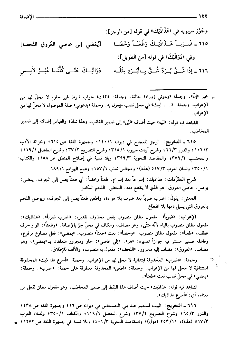 الإعراب: "ضربًا": مفعول مطلق منصوب بفعل محذوف تقديره: "اضرب ضربًا"، "هذاذيك": مفعول مطلق منصوب بالياء لأنه مثنى، وهو مضاف، والكاف في محل جر بالإضافة. "وطعنًا": الواو حرف عطف، "طعنًا": مفعول مطلق منصوب. "وخضا": نعت "طعنًا": منصوب. "يمضي": فعل مضارع مرفوع، وفاعله ضمير مستتر فيه جوازًا تقديره: "هو". "إلى عاصي": جار ومجرور متعلقان بـ"يمضي"، وهو مضاف. "العروق": مضاف إليه مجرور. "النحضا": مفعول به منصوب، والألف للإطلاق.