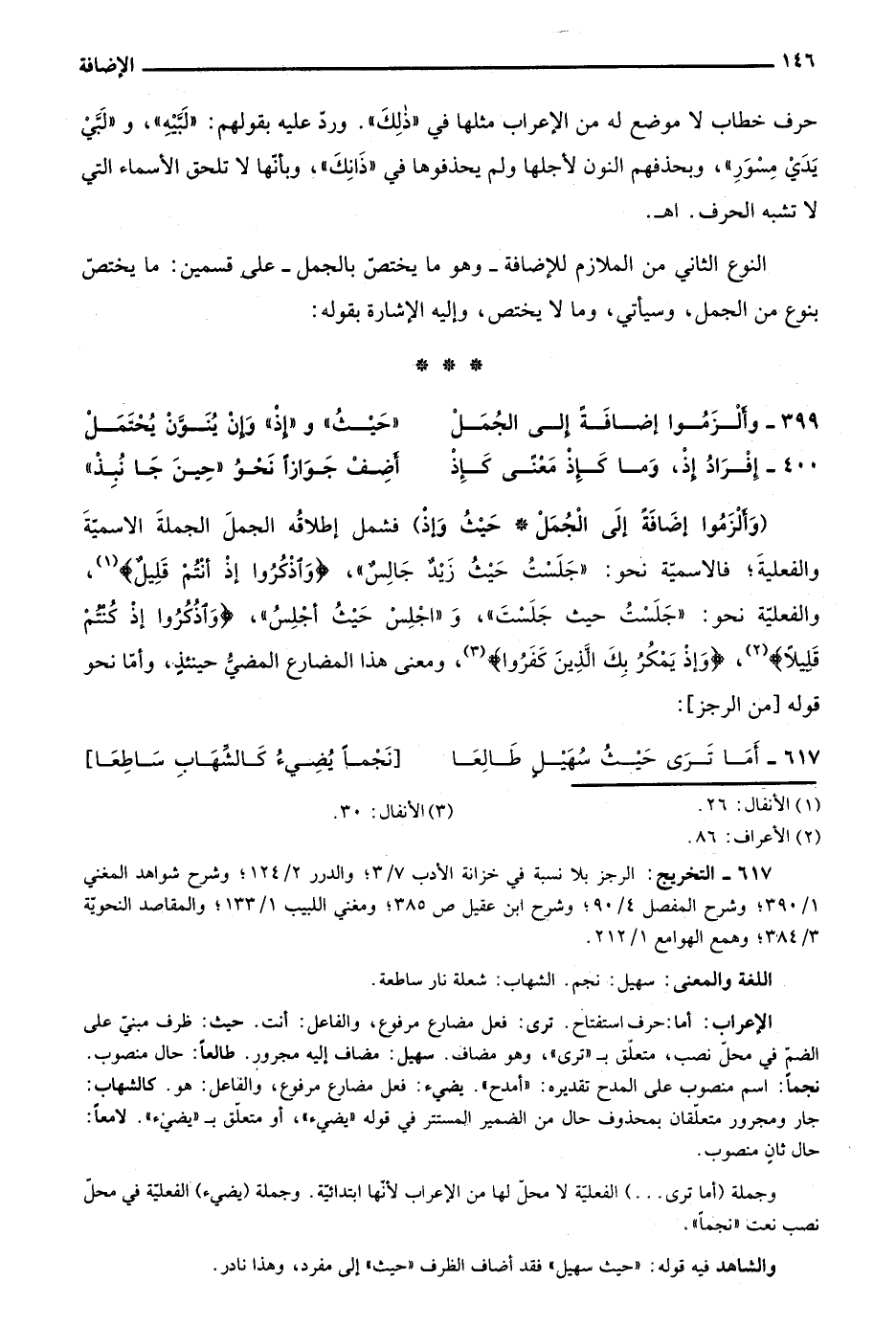 الإعراب: أما: حرف استفتاح. ترى: فعل مضارع مرفوع، والفاعل: أنت. حيث: ظرف مبني على الضم في محل نصب، متعلق بـ"ترى"، وهو مضاف. سهيل: مضاف إليه مجرور. طالعًا: حال منصوب. نجمًا: اسم منصوب على المدح تقديره: "امدح". يضيء: فعل مضارع مرفوع، والفاعل: هو. كالشهاب: جار ومجرور متعلقان بمحذوف حال من الضمير المستتر في قوله "يضيء" أو متعلق بـ"يضيء". لامعًا: حال ثان منصوب.