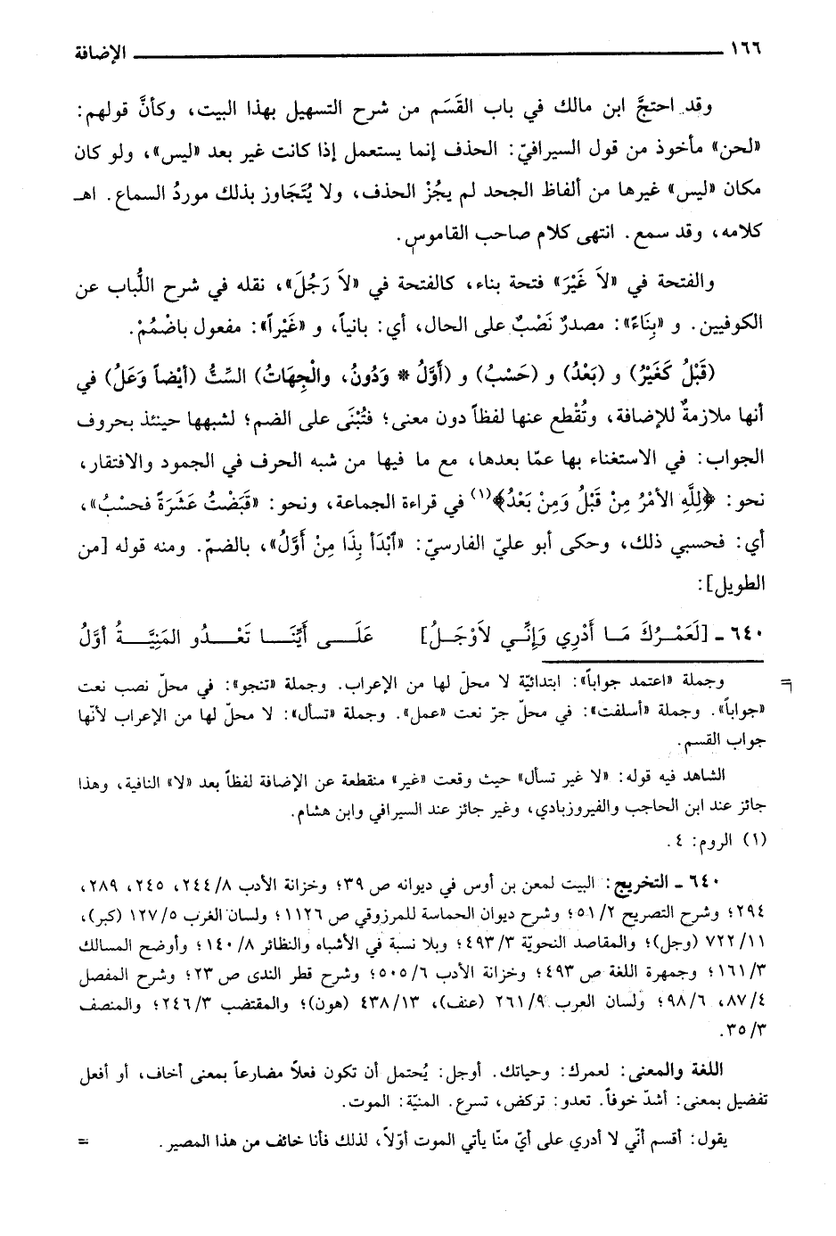 "قبل كغير" و"بعد" و"حسب" و"أول ودون، والجهات" الست "أيضًا وعل" في أنها ملازمة للإضافة، وتقطع عنها لفظا دون معنى؛ فتبنى على الضم؛ لشبهها حينئذ بحروف الجواب: في الاستغناء بها عما بعدها، مع ما فيها من شبه الحرف في الجمود والافتقار، نحو: {لِلَّهِ الْأَمْرُ مِنْ قَبْلُ وَمِنْ بَعْدُ} 1 في قراءة الجماعة، ونحو: "قبضت عشرة فحسب"، أي: فحسبي ذلك، وحكى أبو علي الفارسي: "ابدأ بذا من أَوَّلُ"، بالضم. ومنه قوله "من الطويل":