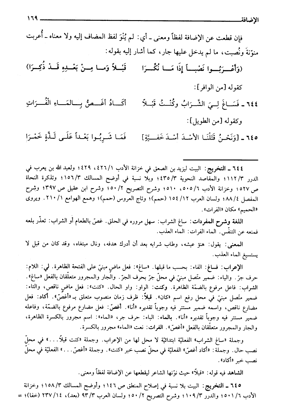 645- التخريج: البيت بلا نسبة في إصلاح المنطق ص146؛ وأوضح المسالك 3/ 158؛ وخزانة الأدب 6/ 501؛ والدرر 3/ 109؛ وشرح التصريح 2/ 50؛ ولسان العرب 3/ 93 "بعد"، 14/ 237 "خفا"؛ =