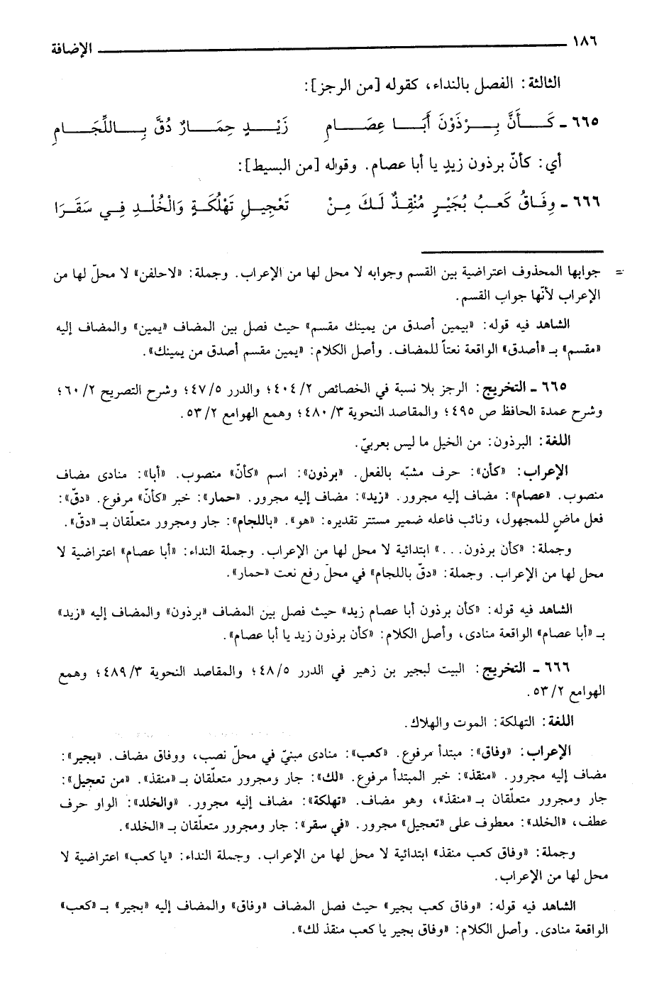 665- التخريج: الرجز بلا نسبة في الخصائص 2/ 404؛ والدرر 5/ 47؛ وشرح التصريح 2/ 60؛ وشرح عمدة الحافظ ص495؛ والمقاصد النحوية 3/ 480؛ وهمع الهوامع 2/ 53.
