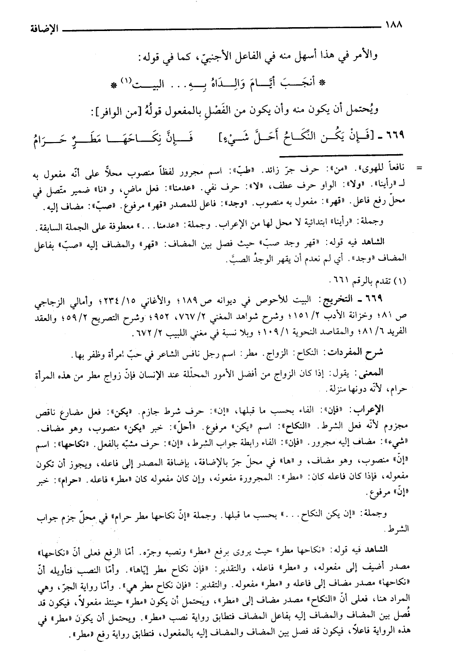 الشاهد فيه قوله: "نكاحها مطر" حيث يروى برفع "مطر" ونصبه وجره. أما الرفع فعلى أن "نكاحها" مصدر أضيف إلى مفعوله، و"مطر" فاعله، والتقدير: "فإن نكاح مطر إياها". وأما النصب فتأويله أن "نكاحها" مصدر مضاف إلى فاعله، و"مطر" مفعوله. والتقدير: "فإن نكاح مطر هي". وأما رواية الجر، وهي المراد هنا، فعلى أن "النكاح" مصدر مضاف إلى "مطر"، ويحتمل أن يكون "مطر" حينئذ مفعولًا، فيكون قد فصل بين المضاف والمضاف إليه بفاعل المضاف فتطابق رواية نصب "مطر". ويحتمل أن يكون "مطر" في هذه الرواية فاعلًا. فيكون قد فصل بين المضاف والمضاف إليه بالمفعول، فتطابق رواية رفع "مطر".