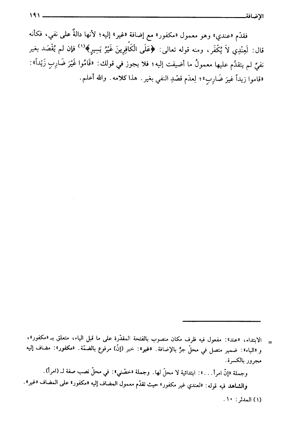 فقدم "عندي" وهو معمول "مكفور" مع إضافة "غير" إليه؛ لأنها دالة على نفي، فكأنه قال: لعندي لا يكفر، ومنه قوله تعالى: {عَلَى الْكَافِرِينَ غَيْرُ يَسِيرٍ} 1 فإن لم يقصد بغير نفي لم يتقدم عليها معمول ما أضيفت إليه؛ فلا يجوز في قولك: "قاموا غيرَ ضاربٍ زيدًا": "قاموا زيدًا غيرَ ضاربٍ"؛ لعدم قصد النفي بغير. هذا كلامه. والله أعلم.