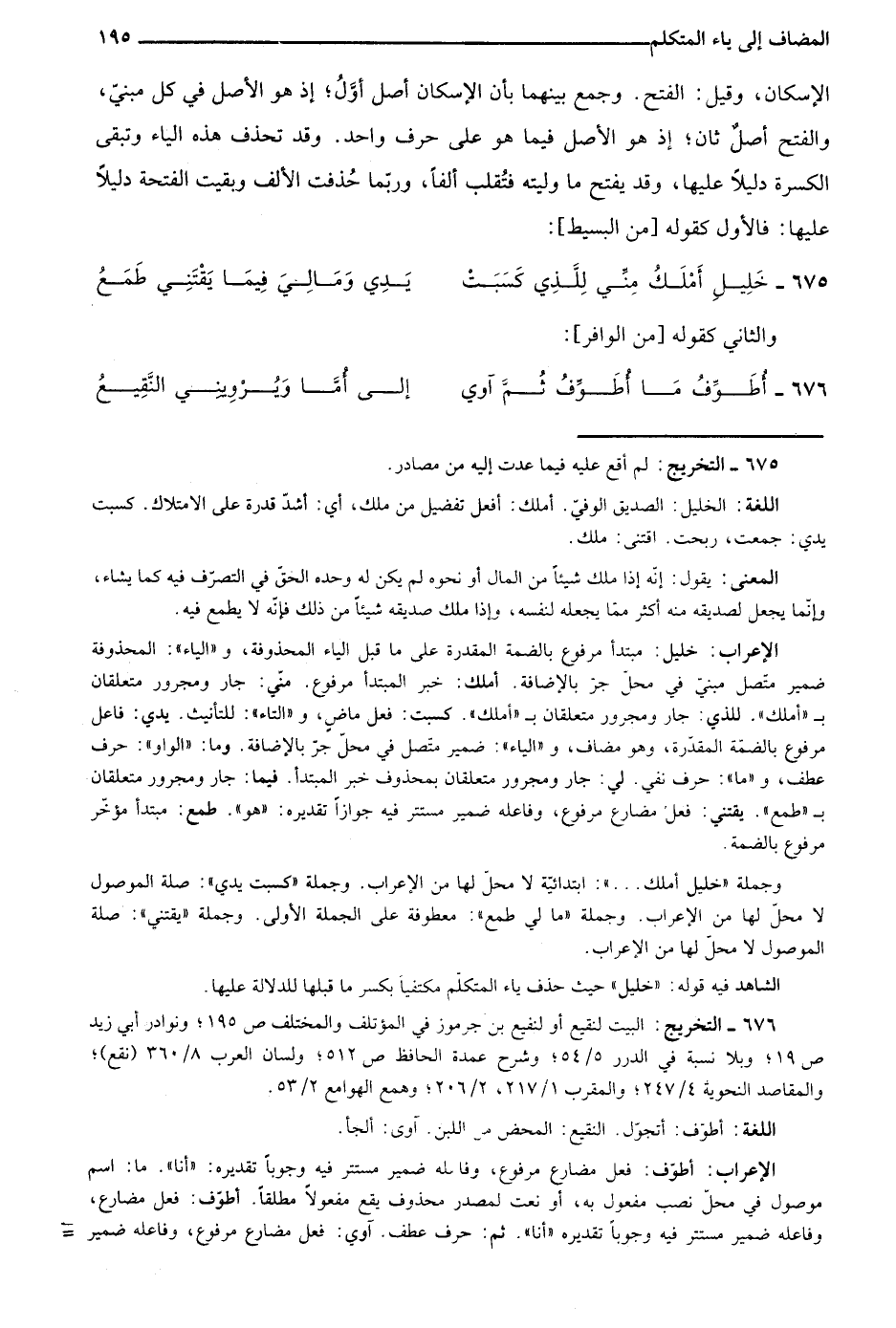 الإعراب: خليل: مبتدأ مرفوع بالضمة المقدرة على ما قبل الياء المحذوفة، و"الياء": المحذوفة ضمير متصل مبني في محل جر بالإضافة. أملك: خبر المبتدأ مرفوع. مني: جار ومجرور متعلقان بـ"أملك". للذي: جار ومجرور متعلقان بـ"أملك". كسبت: فعل ماض، و"التاء": للتأنيث. يدي: فاعل مرفوع بالضمة المقدرة، وهو مضاف، و"الياء": ضمير متصل في محل جر بالإضافة. وما: "الواو": حرف عطف، و"ما": حرف نفي. لي: جار ومجرور متعلقان بمحذوف خبر المبتدأ. فيما: جار ومجرورمتعلقان بـ"طمع". يقتني: فعل مضارع مرفوع، وفاعله ضمير مستتر فيه جوازًا تقديره: "هو". طمع: مبتدأ مؤخر مرفوع بالضمة.