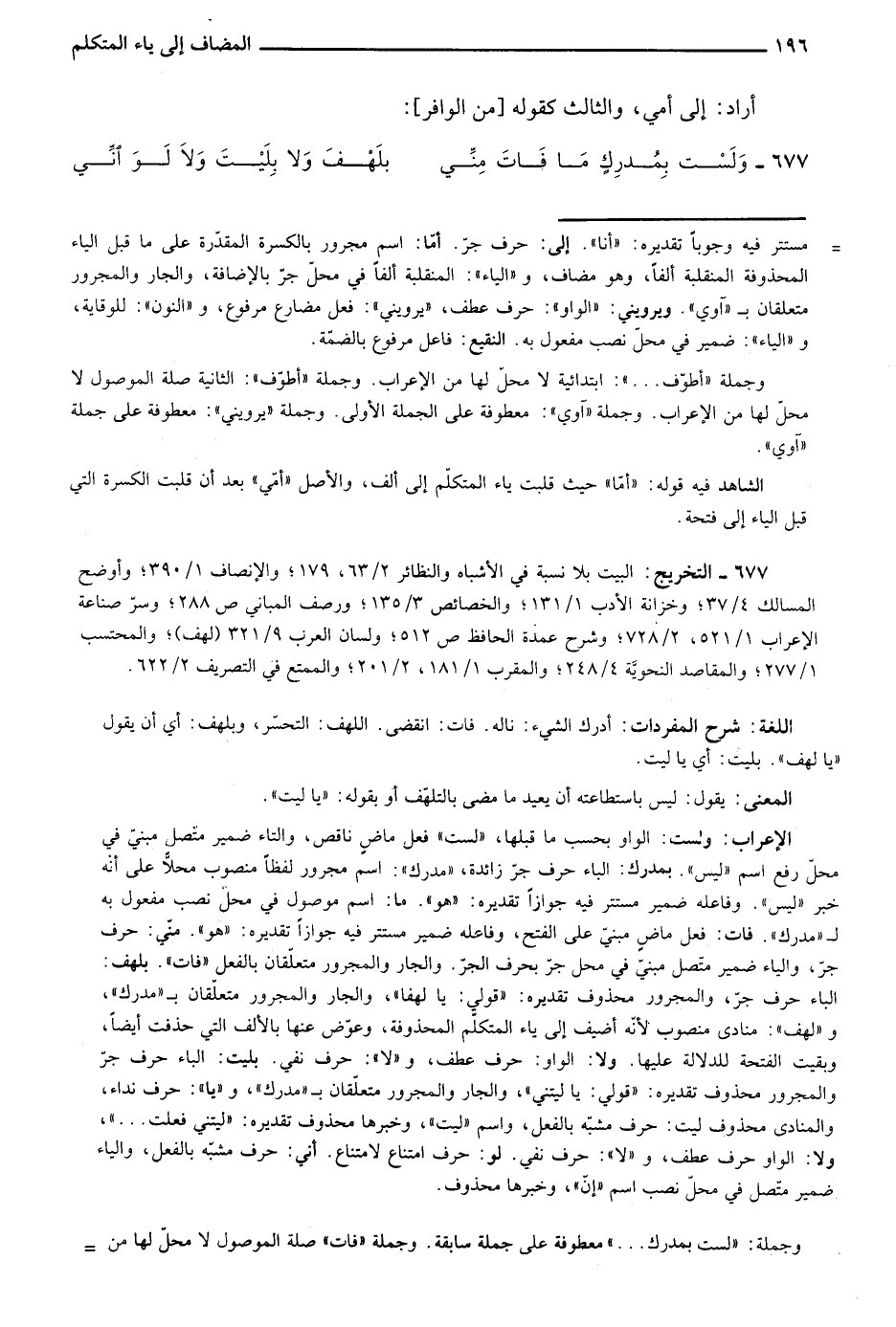 الإعراب: ولست: الواو بحسب ما قبلها، "لست" فعل ماض ناقص، والتاء ضمير متصل مبني في محل رفع اسم "ليس". بمدرك: الباء حرف جر زائدة، "مدرك": اسم مجرور لفظًا منصوب محلًّا على أنه خبر "ليس". وفاعله ضمير مستتر فيه جوازا تقديره: "هو". ما: اسم موصول في محل نصب مفعول به لـ"مدرك". فات: فعل ماضٍ مبني على الفتح، وفاعله ضمير مستتر فيه جوازًا تقديره: "هو". مني: حرف جر، والياء ضمير متصل مبني في محل جر بحرف الجر. والجار والمجرور متعلقان بالفعل "فات" بلهف: الباء حرف جر، والمجرور محذوف تقديره: "قولي": يا لهفا"، والجار والمجرور متعلقان بـ"مدرك"، و"لهف": منادى منصوب لأنه أضيف إلى ياء المتكلم المحذوفة، وعوض عنها بالألف التي حذفت أيضًا، وبقيت الفتحة للدلالة عليها. ولا: الواو: حرف عطف، و"لا": حرف نفي. بليت: الباء حرف جر والمجرور محذوف تقديره: "قولي": يا ليتني"، والجار والمجرور متعلقان بـ"مدرك"، و"يا": حرف نداء، والمنادى محذوف ليت، حرف مشبه بالفعل، واسم "ليت، وخبرها محذوف تقديره: "ليتني فعلت ... "، ولا: الواو حرف عطف، و"لا": حرف نفي. لو: حرف امتناع لامتناع. أني: حرف مشبه بالفعل، والياء ضمير متصل في محل نصب اسم "إن"، وخبرها محذوف.