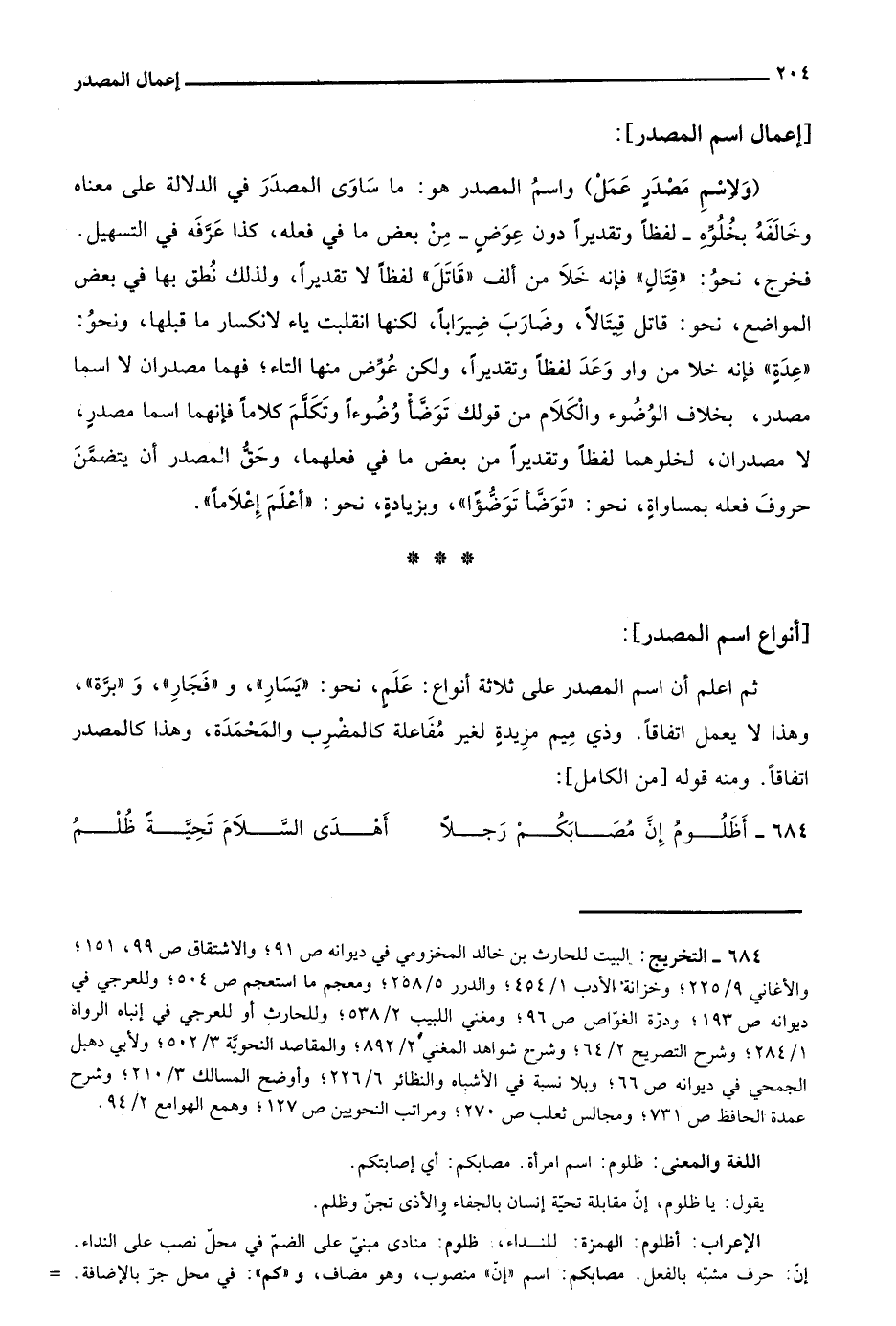 ثم اعلم أن اسم المصدر على ثلاثة أنواع: علم، نحو: "يسار"، و"فجار"، و"برة"، وهذا لا يعمل اتفاقًا. وذي ميم مزيدة لغير مفاعلة كالمضرب والمحمدة، وهذا كالمصدر اتفاقًا. ومنه قوله "من الكامل":