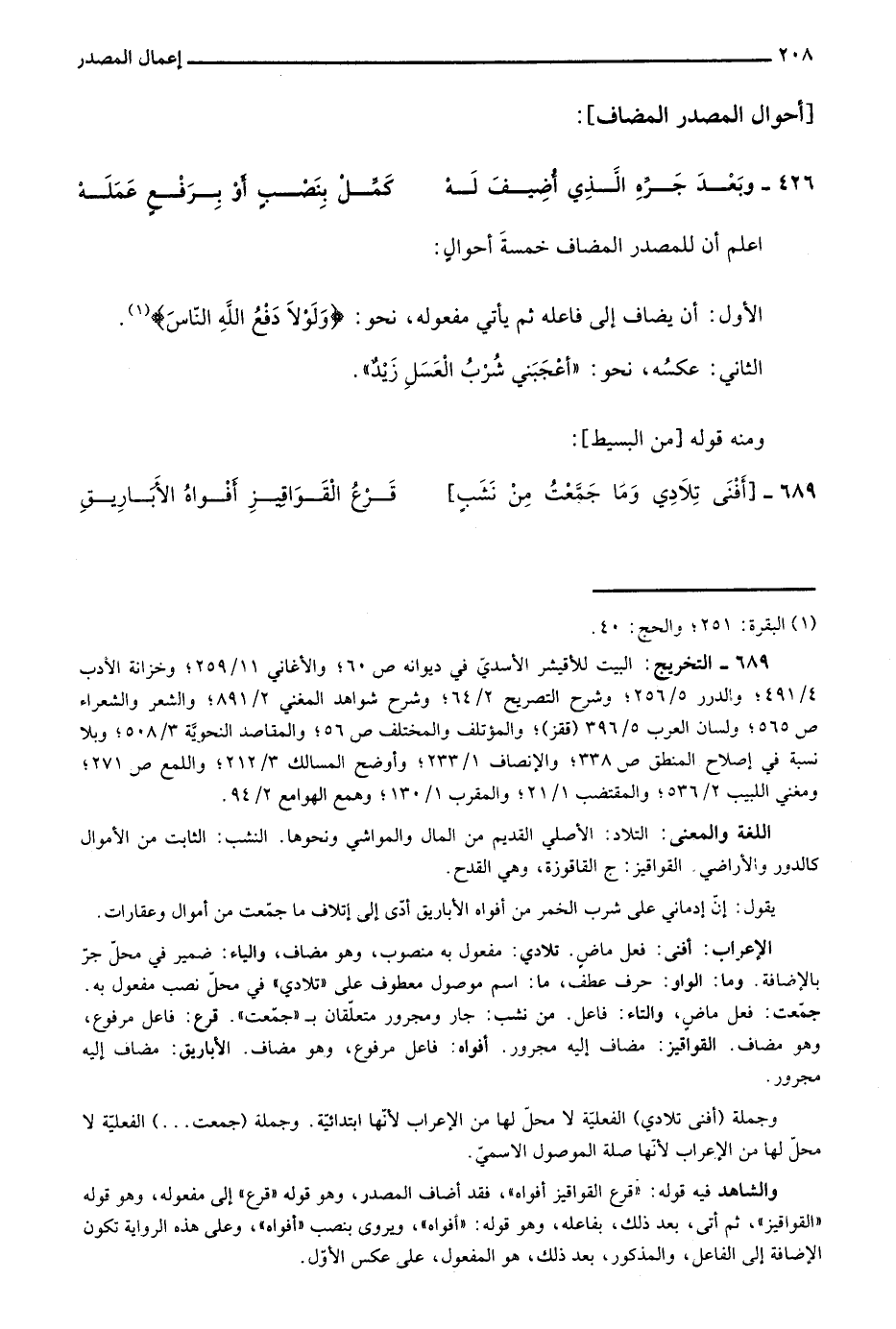 والشاهد فيه قوله: "قرع القوافيز أفواه"، فقد أضاف المصدر، وهو قوله "فرع" إلى مفعوله، وهو قوله "القواقيز"، ثم أتى، بعد ذلك، بفاعله، وهو قوله: "أفواه"، ويروى بنصب "أفواه"، وعلى هذه الرواية تكون الإضافة إلى الفاعل، والمذكور، بعد ذلك، هو المفعول، على عكس الأول.