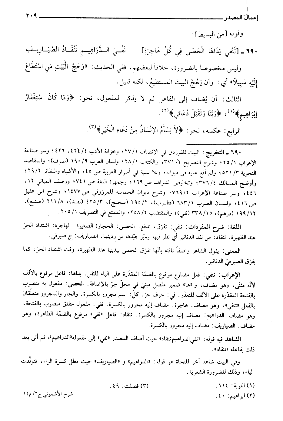الشاهد فيه قوله: "نفي الدراهيم تنقاد" حيث أضاف المصدر "نفي" إلى مفعوله "الدراهيم"، ثم أتى بعد ذلك بفاعله "تنقاد".
