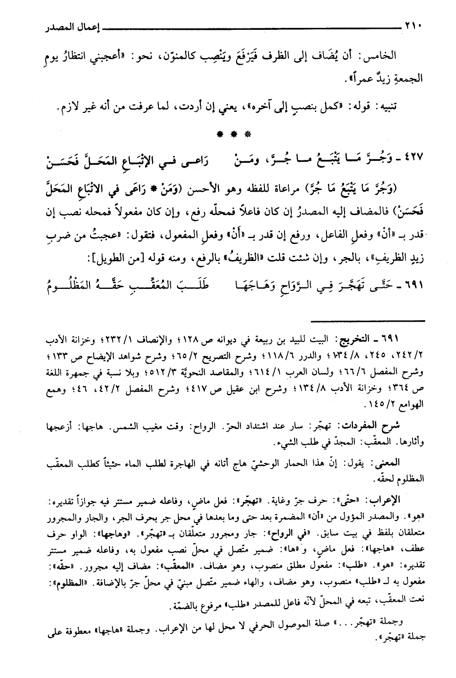الإعراب: "حتى": حرف جر وغاية. "تهجر": فعل ماضٍ، وفاعله ضمير مستتر فيه جوازا تقديره: "هو" والمصدر المؤول من "أن" المضمرة بعد حتى وما بعدها في محل جر بحرف الجر، والجار والمجرور متعلقان بلفظ في بيت سابق. "في الرواح": جار ومجررو متعلقان بـ"تهجر". "وهاجها": الواو حرف عطف، "هاجها": فعل ماض، و"ها": ضمير متصل في محل نصب مفعول به، وفاعله ضمير مستتر تقديره: "هو". "طلب": مفعول مطلق منصوب، وهو مضاف. "المعقب": مضاف إليه مجرور. "حقه": مفعول به لـ"طلب" منصوب، وهو مضاف، والهاء ضمير متصل مبني في محل جر بالإضافة. "المظلوم": نعت المعقب، تبعه في المحل لأنه فاعل للمصدر "طلب" مرفوع بالضمة.