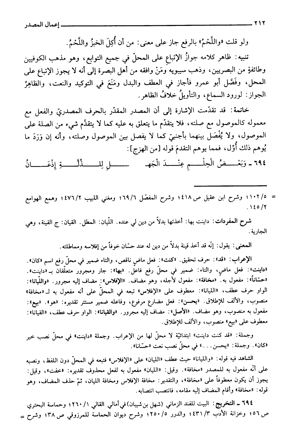 الإعراب: "قد": حرف تحقيق: "كنت": فعل ماض ناقص، والتاء ضمير في محل رفع اسم "كان" "داينت": فعل ماض، والتاء: ضمير في محل رفع فاعل. "بها": جار ومجرور متعلقان بـ"داينت". "حسانًا": مفعول به. "مخافة": مفعول لأجله، وهو مضاف. "الإفلاس": مضاف إليه مجرور. "والليانا": الواو حرف عطف، "الليانا": معطوف على "الإفلاس" تبعه في المحل على أنه مفعول به لـ"مخافة" منصوب، والألف للإطلاق. "يحسن": فعل مضارع مرفوع، وفاعله ضمير مستتر تقديره: "هو". "بيع": مفعول به منصوب، وهو مضاف. "الأصل": مضاف إليه مجرور. "والقيانا": الواو حرف عطف، "القيانا": معطوف على "بيع" منصوب، والألف للإطلاق.