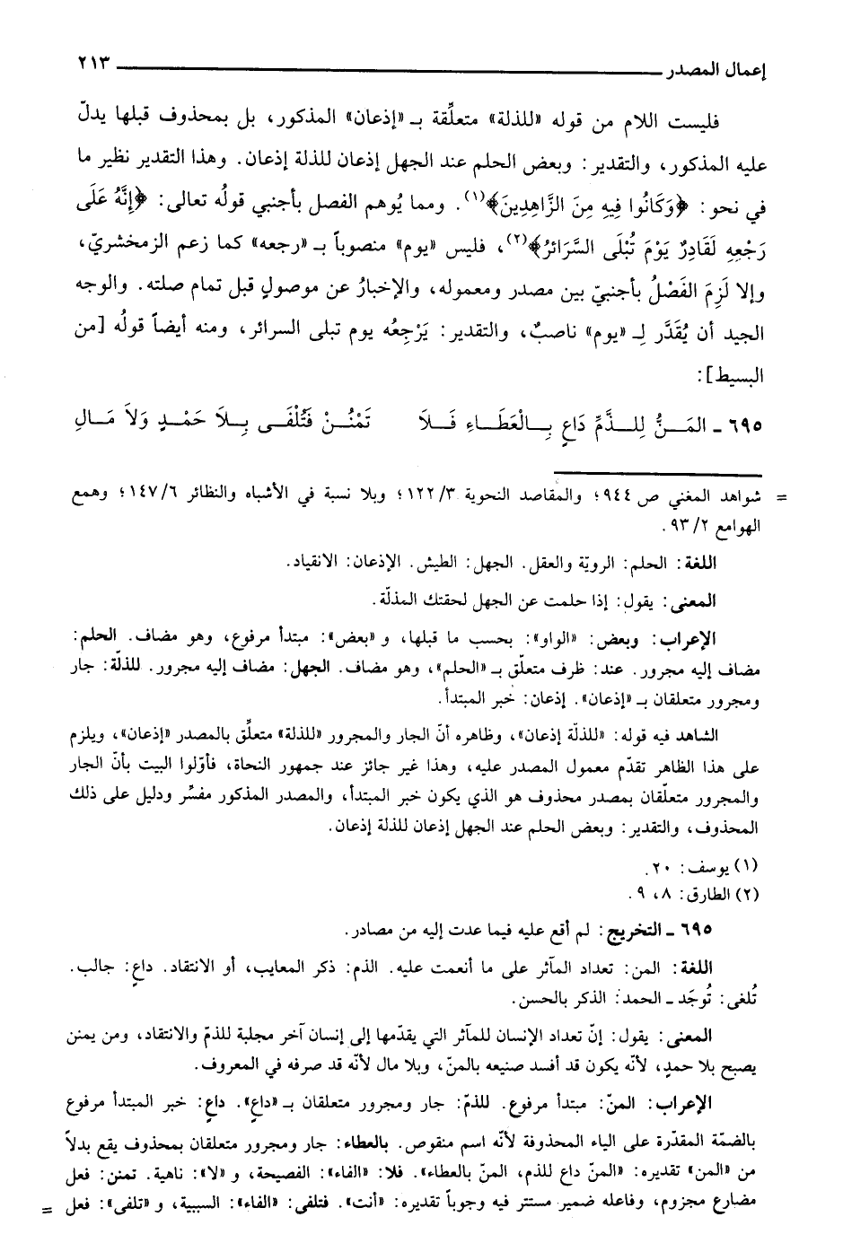فليست اللام من قوله "للذلة" متعلقة بـ"إذعان" المذكور، بل بمحذوف قبلها يدل عليه المذكور، والتقدير: وبعض الحلم عند الجهل إذعان للذلة إذعان. وهذا التقدير نظير ما في نحو: {وَكَانُوا فِيهِ مِنَ الزَّاهِدِين} 1. ومما يوهم الفصل بأجنبي قوله تعالى: {إِنَّهُ عَلَى رَجْعِهِ لَقَادِرٌ، يَوْمَ تُبْلَى السَّرَائِرُ} 2، فليس "يوم" منصوبًا بـ"رجعه" كما زعم الزمخشري، وإلا لزم الفصل بأجنبي بين مصدر ومعموله، والإخبار عن موصول قبل تمام صلته. والوجه الجيد أن يقدر لـ"يوم" ناصب، والتقدير: يرجعه يوم تبلى السرائر، ومنه أيضًا قوله "من البسيط":