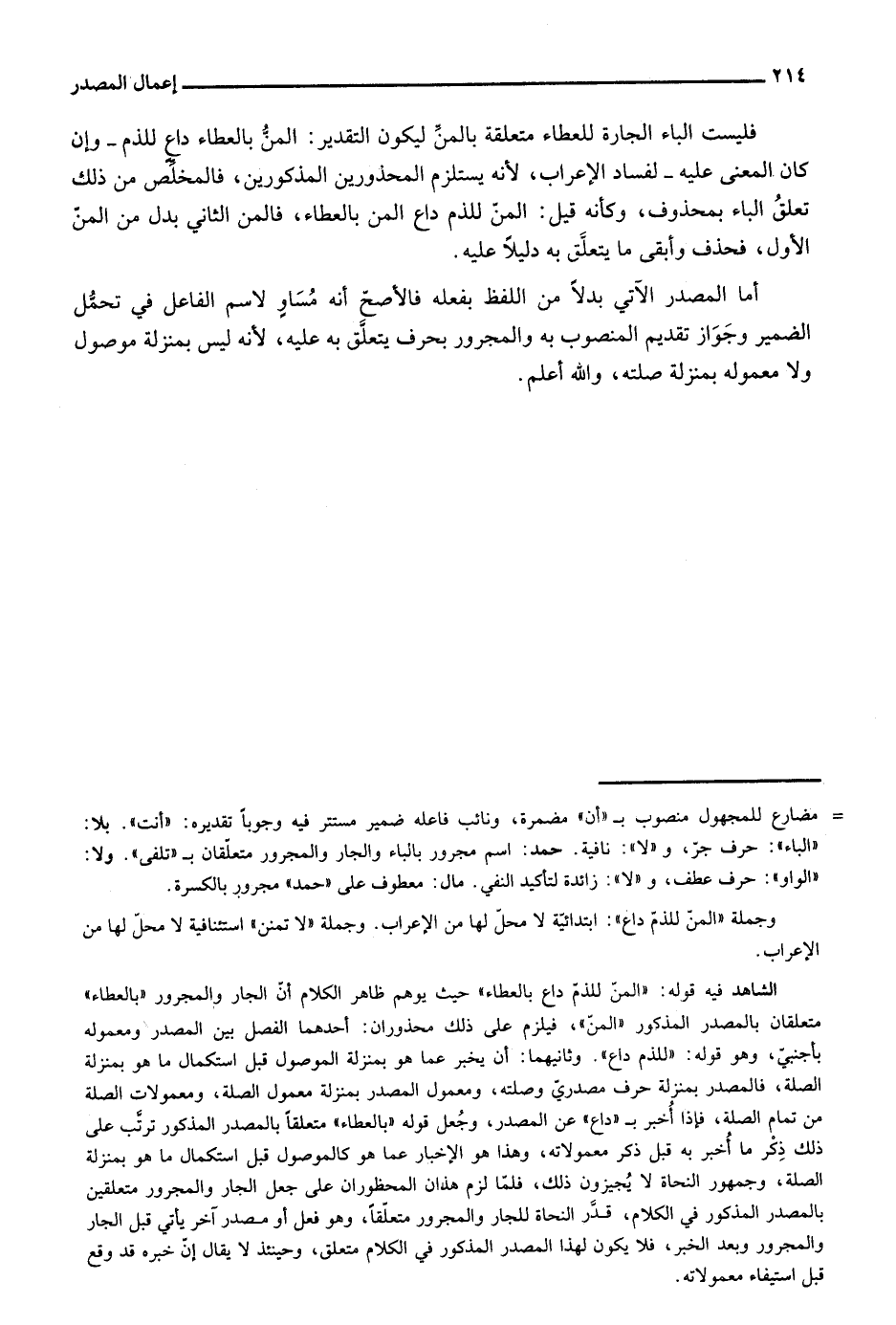 الشاهد فيه قوله: "المن للذم داع بالعطاء" حيث يوئم ظاهر الكلام أن الجار والمجرور "بالعطاء" متعلقان بالمصدر المذكور "المن"، فيلزم على ذلك محذوران: أحدهما الفصل بين المصدر ومعموله بأجنبي، وهو قوله: "للذم داع". وثانيهما: أن يخبر عما هو بمنزلة الموصول قبل استكمال ما هو بمنزلة الصلة، فالمصدر بمنزلة حرف مصدري وصلته، ومعمول المصدر بمنزلة معمول الصلة، ومعمولات الصلة من تمام الصلة، فإذا أخبر بـ"داع" عن المصدر، وجعل قوله: "بالعطاء" متعلقًا بالمصدر المذكور ترتب على ذلك ذكر ما أخبر به قبل ذكر معمولاته، وهذا هو الإخبار عما هو كالموصول قبل استكمال ما هو بمنزلة الصلة، وجمهور النحاة لا يجيزون ذلك، فلما لزم هذان المحظوران على جعل الجار والمجرور متعلقين بالمصدر المذكور في الكلام، قدر النحاة للجار والمجرور متعلقًا، وهو فعل أو مصدر آخر يأتي قبل الجار والمجرور وبعد الخبر، فلا يكون لهذا المصدر المذكور في الكلام متعلق، وحينئذ لا يقال إن خبره قد وقع قبل استيفاء معمولاته.